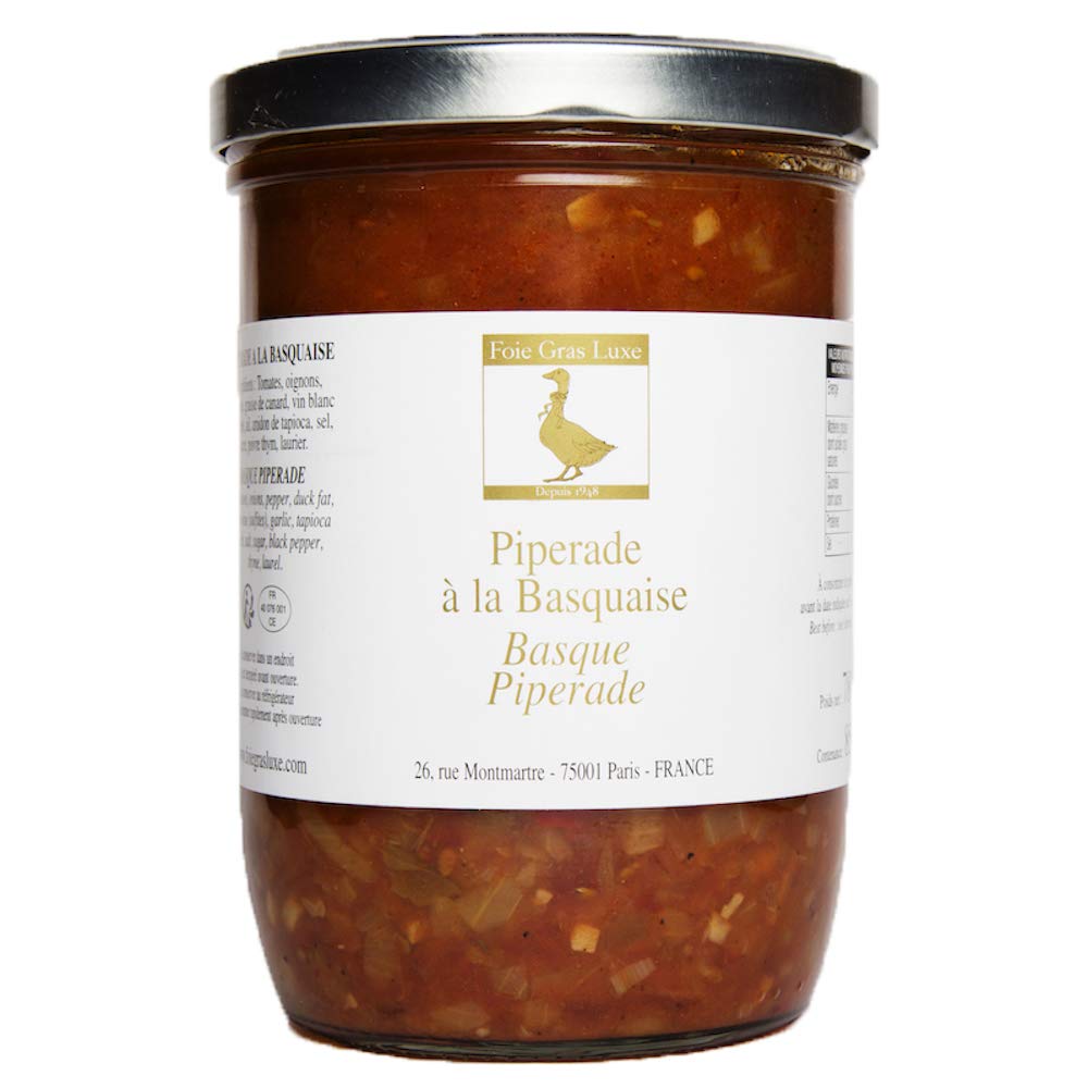This canned vegetable mix, known as Basque-style piperade, is the perfect accompaniment to meat and fish. Healthy, versatile, and beautifully cooked, it brightens up your hot, warm, or cold dishes. The History of Piperade: Piperade is a blend of sun-ripened vegetables. This vegetable side dish is recognized as a Basque gastronomic accompaniment. The colors of the Basque flag are reflected in this traditional dish: red from the tomatoes, green from the peppers, and white from the onions. AUTHENTIC, COMFORTING, AND GOURMET CUISINE: Even the simplest dishes require impeccable ingredients. These sun-ripened vegetables offer familiar yet unique flavors from our Landes cuisine. The raw ingredients are rigorously selected and inspected by our local chefs. The duck fat used to prepare this blend of sun-ripened vegetables comes from our farm. A FARM WITH UNIQUE EXPERTISE It is in the heart of our farm in the Landes region that your dishes are prepared and preserved by our artisan chefs. For over 70 years, Foie Gras Luxe Farm has been raising geese and ducks in harmony with traditional methods and the Landes environment. Our free-range farming allows us to offer you foie gras, duck breast, and other fine specialties from the Southwest. PREPARING PIPERADE BASQUE-STYLE Sun-ripened vegetables are best warmed in a saucepan over low heat, stirring constantly. INGREDIENTS: Tomatoes, Onions, Bell Peppers, Duck Fat, White Wine, Tapioca Flour, Salt, Sugar, Pepper, Thyme, Bay LeafPiperade à la Basquaise - Mélange de légume 780 g pour 4 5 personnes - Bocal en verre - conserveDESCRIPTION DU PRODUIT Ce mélange de légumes en conserve nommé piperade à la basquaise est parfait en accompagnement des viandes et poissons. Sain, facile à accorder et bien compotée, elle ensoleille vos plats chauds, tièdes ou froids. L'histoire de la piperade La piperade est un mélange composé de légumes du soleil. Cet accompagnement de légume est reconnu comme un accompagnement gastronomique basque. Les couleurs du drapeau basque dans un plat traditionnel : la piperade comporte du rouge avec la tomate, du vert avec les poivrons et du blanc avec les oignons. UNE CUISINE AUTHENTIQUE RÉCONFORTANTE ET GASTRONOMIQUE Les plats les plus simples nécessitent des ingrédients de qualité irréprochables. Les légumes du soleil cuisinés offrent des saveurs familières et singulières issues de notre cuisine des Landes. Les ingrédients premiers sont sélectionnés et contrôlés rigoureusement par nos cuisinier.es landais. La graisse de canard utilisée pour concocter le mélange de légumes du soleil est issue de l'élevage de la ferme. UNE FERME AU SAVOIR FAIRE UNIQUE C'est au coeur de notre ferme dans les Landes que vos plats sont préparés et mis en conserve par les artisans cuisiniers. La ferme Foie Gras Luxe élève depuis plus de 70 ans les oies et canards en harmonie avec les méthodes traditionnelles et l'environnement des Landes. Les élevages en plein air nous permettent de vous offrir des foies gras, magrets de canard et autres spécialités fines du sud-ouest. PRÉPARER LA PIPERADE À LA BASQUAISE Les légumes du soleil se réchauffent de préférence à la casserole à feu doux en remuant sans cesse. INGRÉDIENTS : Tomates, Oignons, Poivrons, Graisse de canard, Vin blanc, Farine de tapioca, Sel Sucre Poivre Thym Laurier