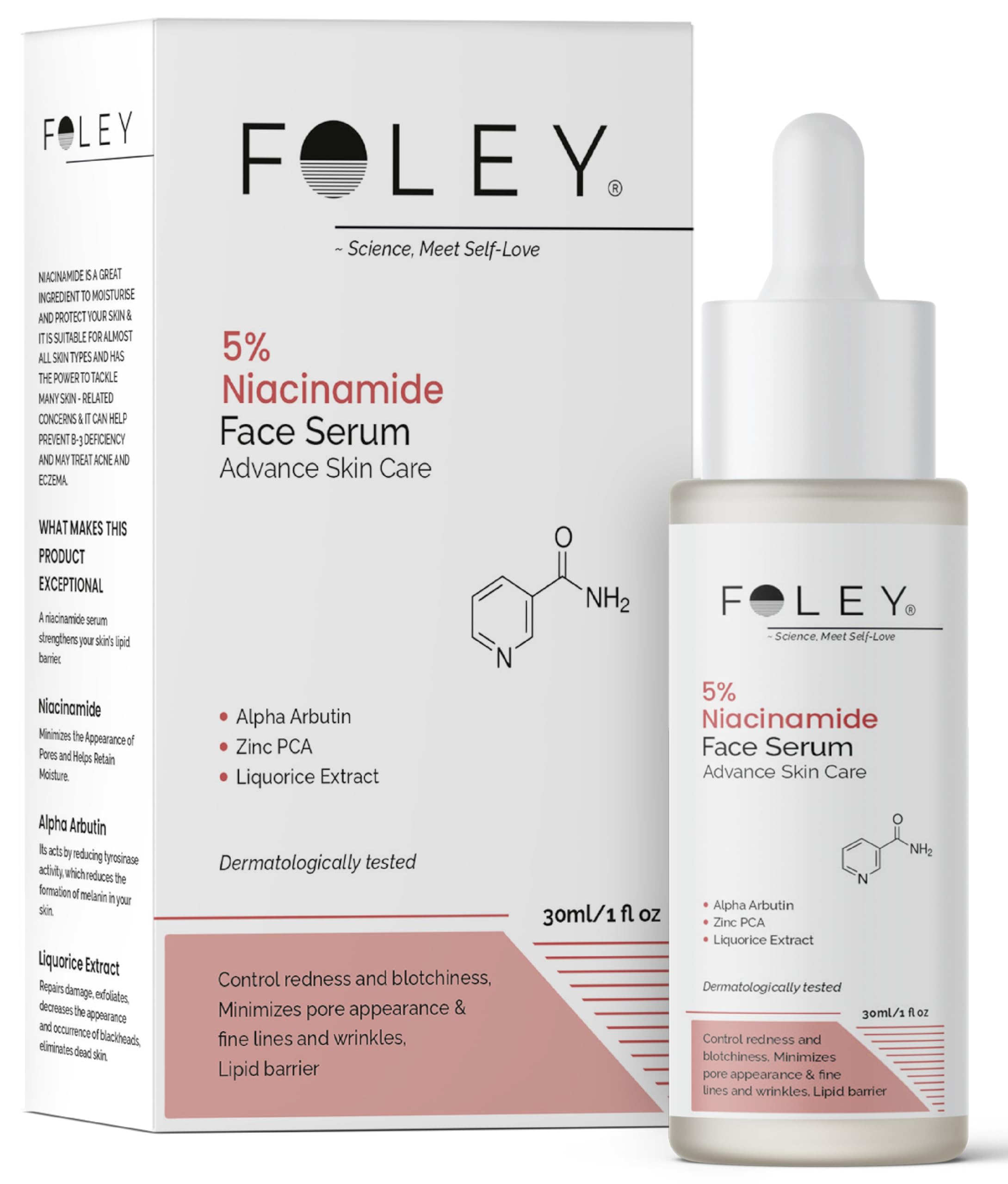 Foley 5% Niacinamide Serum for Acne Marks Dark Spots and Redness | With Alpha Arbutin and Zinc PCA | Oil Control Face Serum for All Skin Types | 30ml