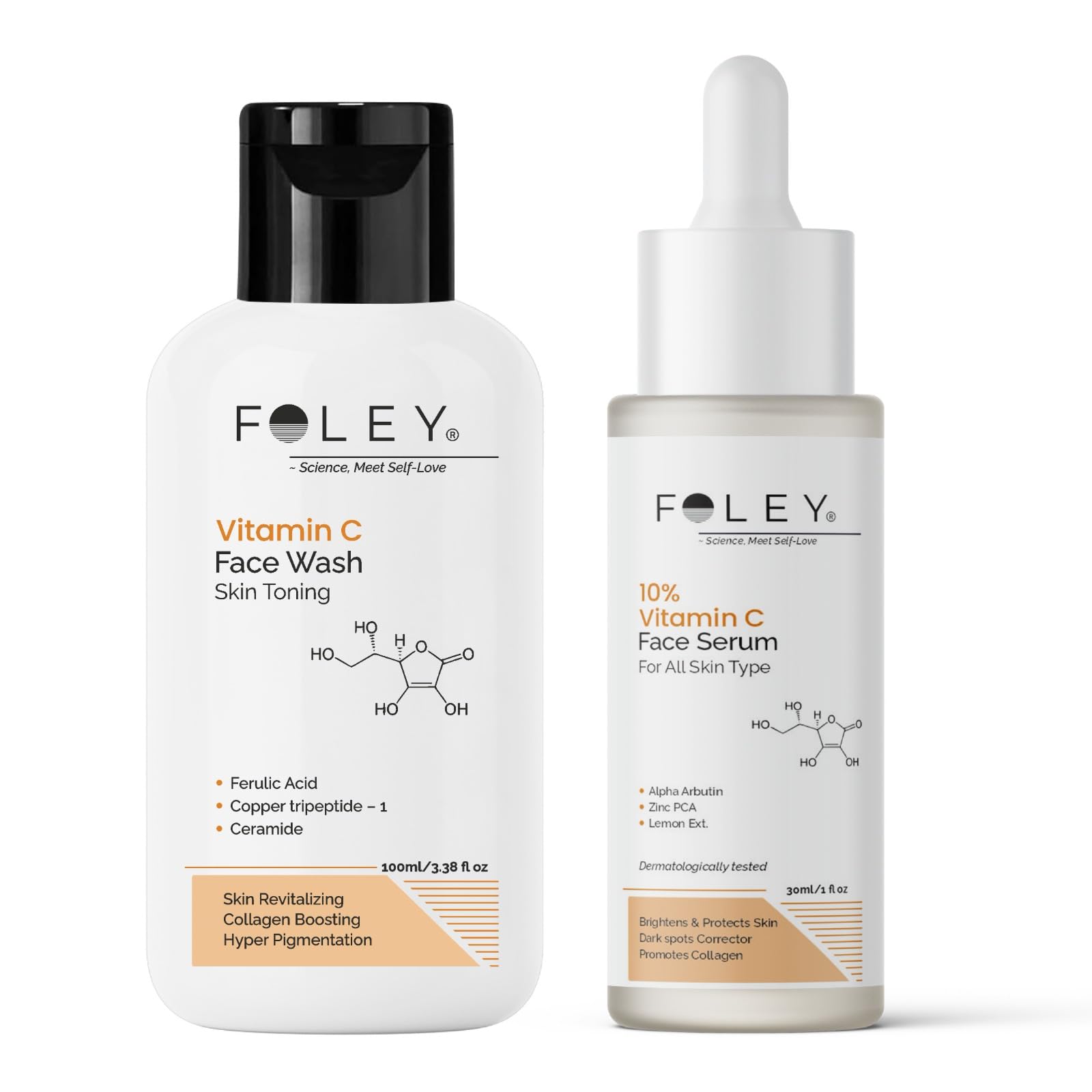 FOLEY Skincare Combo Vitamin C Face Wash (100 ml) & 10% Vitamin C Face Serum (30 ml) Daily Cleansing & Brightening Routine for All Skin Types