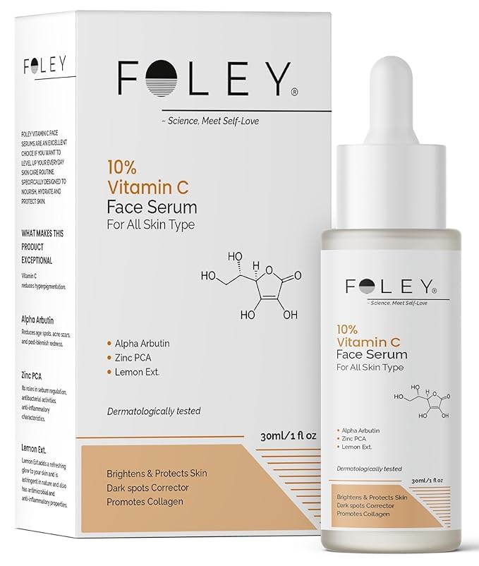 Foley Vitamin C 10% Serum for Face - Brightens Skin Fades Dark Spots & Acne Marks - With Alpha Arbutin Ferulic Acid Zinc PCA - 30ml
