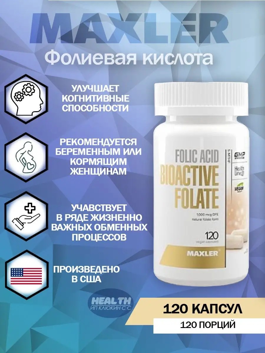 Maxler Фолиевая кислота Bioactive Folate 1000 мкг, 120 капсул – биологически активная добавка, способствующая здоровому росту и развитию клеток.