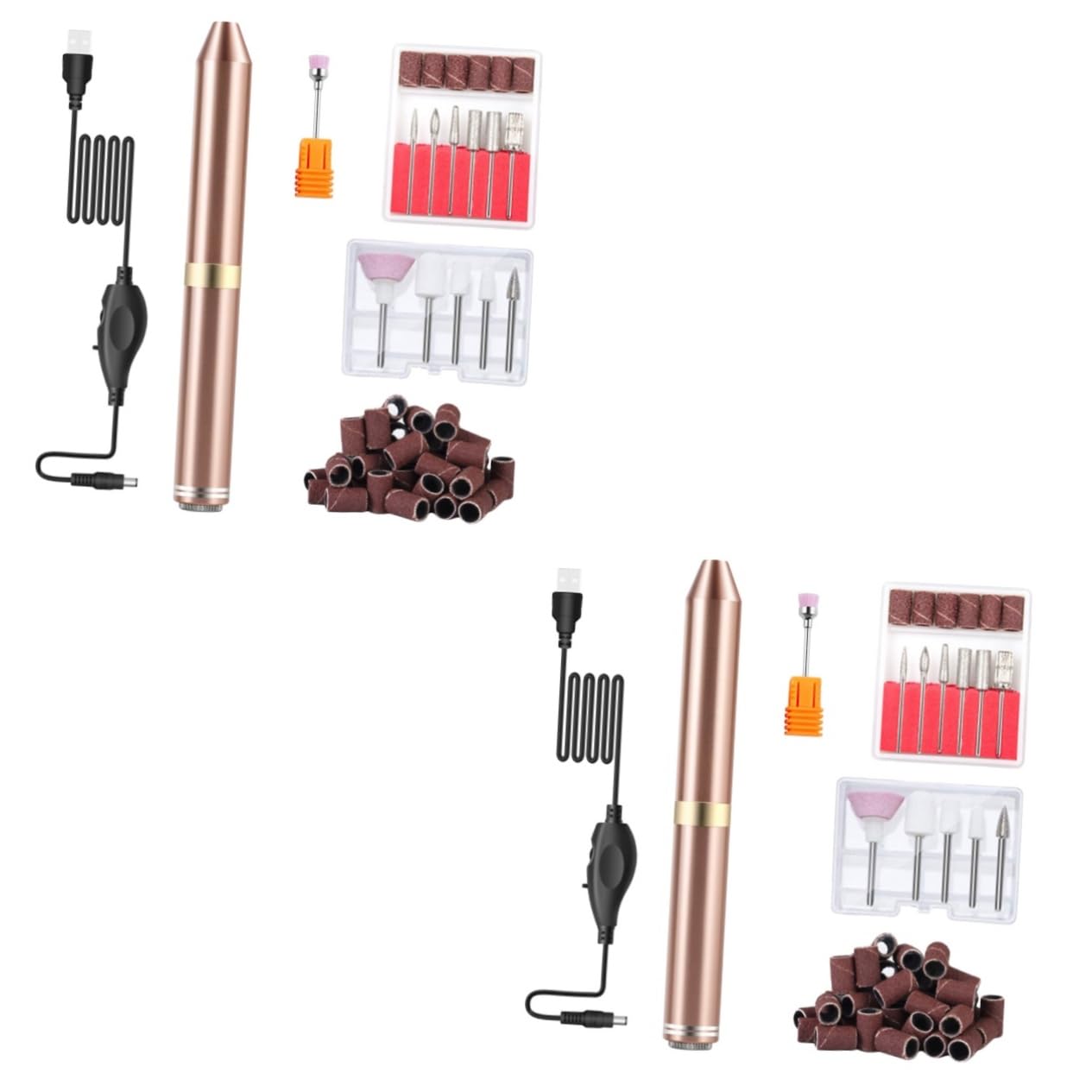 Package List 10 x sanding bands 2 x electric nail file 2 x USB cable 24 x drill bits Features -Material: ABS Nail Art Polisher -Color: As Shown pedicure care kit -Size: 13.20X1.50X1.50cm/5.19X0.59X0 USB Manicure Drills. -Rotation speed: 0-20000RPM electric nail - Small and compact size, you can carry anduse it everywhere you go Nail File Machine. - Low noise design, will not interruptother during nail polish Acrylic Nail Drill. - Adopt premium ABS material for durableuse manicure tool. - Can be given as a present to your familyand friend Manicure Polisher. - Various grinding heads and drill bits tomake your nail grinding and filing easier nail drill tool. Goods Description manicure pedicure kit Are you looking for a professional, yetaffordable electric manicure pedicure drill set? Are you in search of a sturdy,trustworthy tool that can do multiple jobs at once? If yes, look no further!Our electric manicure pedicure drill set must meet your needs.nail art drill kit It is one of thebest choices for you SAFETY WARNING 1