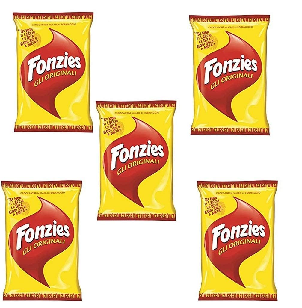 Fonzies Originals Crispy Cheesy Corn Snack. Not fried, but baked. This crispy Italian snack, the famous Fonzies appetizer, is made from corn and flavored cheese. Ingredients: Cornmeal, vegetable fat, cheese powder, whey powder, spices, salt, yeast extract, flavor enhancers. Contains milk. May contain traces of wheat and peanuts. Nutritional Information 1 pack 517 kJ 124 kcal 6 x 100 g 2200 kJ 525 kcal INGREDIENTS Corn semolina 62.2 , palm oil, processed cheese powder 6 , whey powder, salt, flavorings, baking powder, yeast extract, flavor enhancers (E621, E627, E631), lactose (from milk), smoke flavoring. May contain wheat, peanuts. INSTRUCTIONS Ready to eat, no preparation required. See moreFONZIES Lot de 5 croustilles au fromage italien 100 gDESCRIPTION DU PRODUIT DESCRIPTION DU PRODUIT Fonzies Snack de maïs croustillant au fromage Originals. Pas frit, mais cuit au four plat plat plat italien croustillant, le célèbre apéritif Fonzies Fabriqué à partir de maïs et de fromage aromatisé, cet apéritif est cuit au four et non frit. Ingrédients : semoule de maïs, graisse végétale, fromage en poudre, lactosérum en poudre, épices, sel, extrait de levure, exhausteurs de goût. Contient du lait. Peut contenir des traces de blé et d'arachides. Informations nutritionnelles 1 paquet 517 kJ 124 kcal 6 x 100 g 2200 kJ 525 kcal INGRÉDIENTS Semoule de maïs 62,2 , huile de palme, poudre de fromage fondu 6 , poudre de lactosérum, sel, arômes, poudre de cuisson, extrait de levure, exhausteurs de saveur (E621, E627, E631), lactose (à partir de lait), arôme de fumée. Peut contenir du blé, des cacahuètes. MODE D'EMPLOI Prêt à manger, aucune préparation nécessaire Voir plus