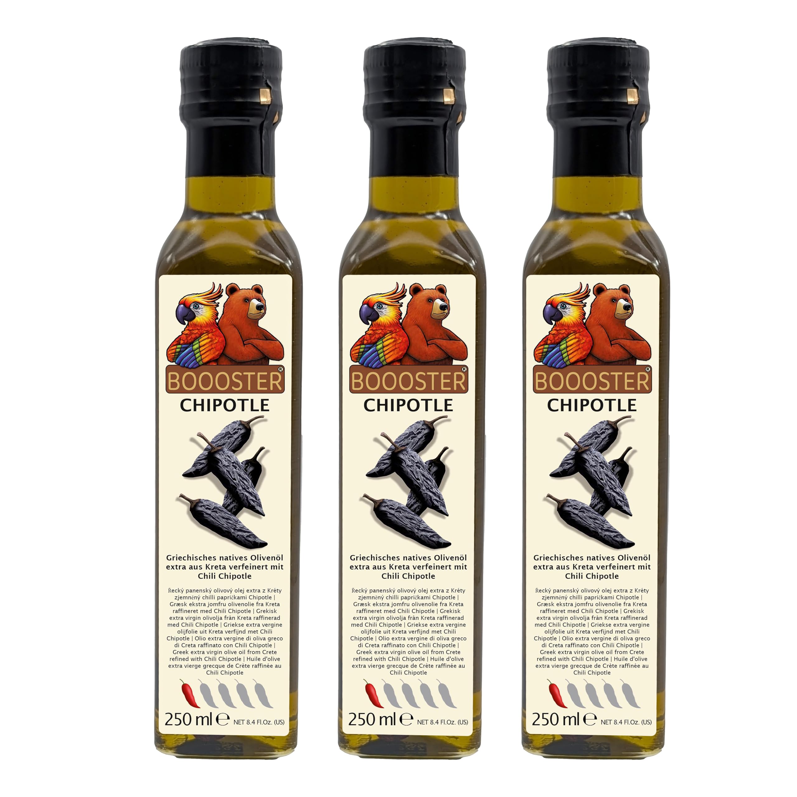BOOOSTER Huile épicée APSU - 3 x 250 ml - Huile d'olive extra vierge de Crète de Grèce - Avec gousses de piment chipotle - Légèrement épicées - Huile de vinaigrette de qualité supérieure - Pour la
