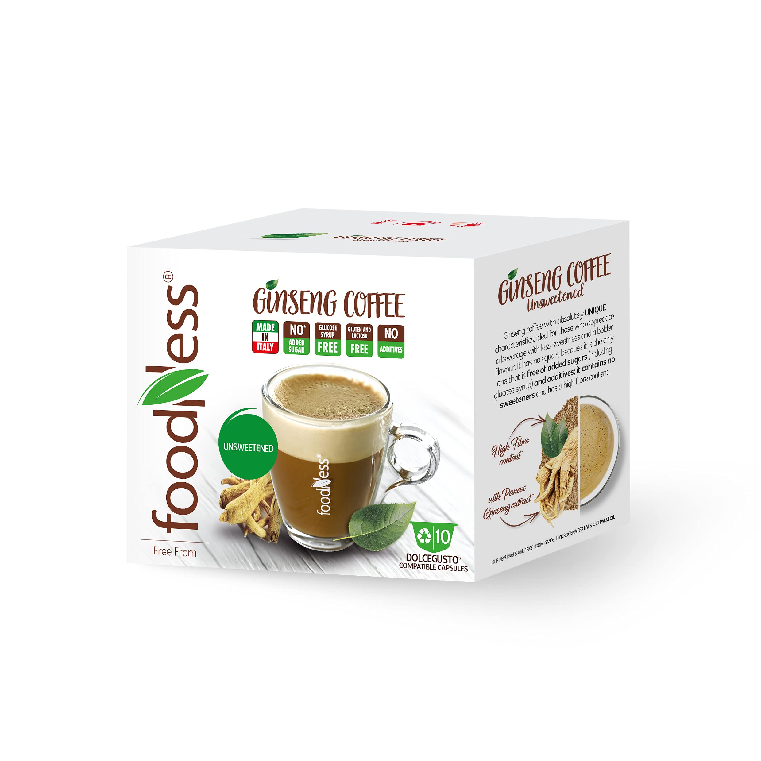 Size: 10 units (1 pack). : To start your day with a little more energy, try the new FoodNess Gentreng line. This bitter ginseng coffee, made with ginseng extract, is sweetener-free and boasts a strong, robust flavor. It's the perfect companion for your breaks, offering serenity and taste with its incomparable caramel aroma. Bitter ginseng coffee is ideal for those who prefer a stronger, less sweet taste. Lactose-free, with no added sugar, no additives, and gluten-free, it can be enjoyed by everyone with the sole purpose of savoring a delicious cup of ginseng coffee. The product comes in recyclable capsules to reduce pollution and promote recycling. Don't miss the opportunity to enjoy your bitter ginseng coffee at home, just like in a café, simply by using your Dolce Gusto coffee machine. Ingredients: Soluble vegetable fibers , instant coffee (21.6 ), unhydrated coconut fat, milk powder, ginseng extract (3.25 ), milk proteins, flavorings, salt. INSTRUCTIONS FOR USE Insert one capsule into the Dolce Gusto coffee machine and prepare your coffee. SAFETY WARNING No specific warnings, but the product is free of gluten, lactose, added sugars, and additives. See moreFoodNess - Capsule de café Bitterer Ginseng compatible avec le système Dolce Gusto, sans gluten, sans lactose et sans sucre ajouté (1 boîte Tot. 10 gélules)DESCRIPTION DU PRODUIT DESCRIPTION DU PRODUIT Taille : 10 unités (1 emballage). Description du produit : pour commencer votre journée avec un peu plus d'énergie, essayez la nouvelle ligne FoodNess Gentreng. Le café au ginseng amer, l'extrait de ginseng, sans édulcorants et avec un goût puissant et puissant, est un compagnon parfait pour vos pauses et offre sérénité et goût avec son arôme incomparable de caramel. Le café au ginseng amer est idéal pour les amateurs d'un goût plus fort et moins sucré. Sans lactose, sans sucre ajouté, sans additifs et sans gluten, il peut être consommé par tout le monde avec le seul but de boire une bonne tasse de café de ginseng. Le produit se présente en capsules recyclables dans le but de réduire la pollution et de favoriser le recyclage. Ne manquez pas l'occasion de déguster votre café avec du ginseng amer directement à la maison comme au café et utilisez simplement votre machine à café avec le système Dolce Gusto. Ingrédients : fibres végétales solubles , café soluble (21,6 ), graisse de noix de coco non hydratée, poudre de lait, extrait de ginseng (3,25 ), protéines de lait, arômes, sel. MODE D'EMPLOI Insérez une capsule dans la machine à café Dolce Gusto et préparez le café. AVERTISSEMENT DE SÉCURITÉ Aucun avertissement spécifique, mais le produit est exempt de gluten, lactose, sucres ajoutés et additifs. Voir plus