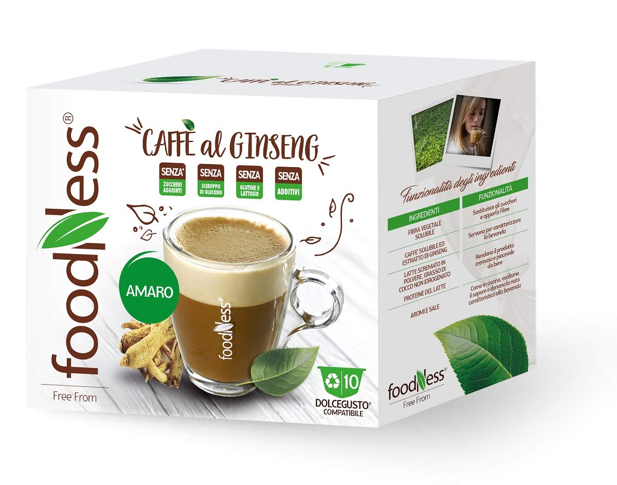 To start your day with an extra boost, try the new Foodness ginseng beverage line. Amaro Ginseng Coffee, made with ginseng extract, is free of sweeteners and boasts a strong, assertive flavor. It's the perfect companion for your breaks, offering serenity and deliciousness with its unique caramel aroma. Amaro Ginseng Coffee is ideal for those who prefer a firmer, less sweet taste. Lactose-free, with no added sugar, no additives, and gluten-free, it can be enjoyed by anyone simply for the pleasure of a good cup of ginseng coffee. The product comes in recyclable capsules to reduce pollution and promote recycling. Don't miss the opportunity to enjoy your Amaro Ginseng Coffee at home, just like at a café, simply using your Dolce Gusto coffee machine. INGREDIENTS Soluble vegetable fiber , instant coffee (21.6 ), non-hydrogenated coconut oil, skimmed milk powder, ginseng extract (3.25 ), milk proteins, flavorings, salt. INSTRUCTIONS FOR USE Insert the capsule into the Dolce Gusto machine, close the machine, select the desired program, and wait for the coffee to brew. SAFETY WARNING This product naturally contains caffeine. It is recommended to consume in moderation. See moreFoodNess - Capsule café au ginseng amer compatible avec le système Dolce Gusto sans gluten, lactose et sucres ajoutés(3 boîtes Tot. 30 capsules)DESCRIPTION DU PRODUIT DESCRIPTION DU PRODUIT Pour commencer vos journées avec une pincée de charge supplémentaire, essayez la nouvelle ligne de boissons au ginseng Foodness. Café au ginseng Amaro, avec extrait de ginseng, exempt de tout édulcorant et au goût fort et décidé, c'est une excellente compagnie pour vos moments de pause en vous donnant sérénité et goût avec son arôme unique de caramel. Le café au ginseng Amaro est idéal pour ceux qui aiment un goût plus ferme et moins doux. Sans lactose, sans sucre ajouté, sans additifs et sans gluten, peut être consommé par n'importe qui pour le seul plaisir de boire une bonne tasse de café au ginseng. Le produit se présente dans des capsules recyclables pour réduire la pollution et éducation au recyclage. Ne manquez pas l'occasion de boire votre café au ginseng Amaro directement chez vous comme au bar, en utilisant simplement votre machine à café système Dolce Gusto. INGRÉDIENTS Fibre végétale soluble , café soluble (21,6 ), graisse de coco non hydrogénée, lait écrémé en poudre, extrait de ginseng (3,25 ), protéines de lait, arômes, sel. MODE D'EMPLOI Insérez la capsule dans l'appareil Dolce Gusto, fermez l'appareil, sélectionnez le programme souhaité et attendez la préparation du café. AVERTISSEMENT DE SÉCURITÉ Ce produit contient naturellement de la caféine. Il est recommandé de consommer avec modération. Voir plus