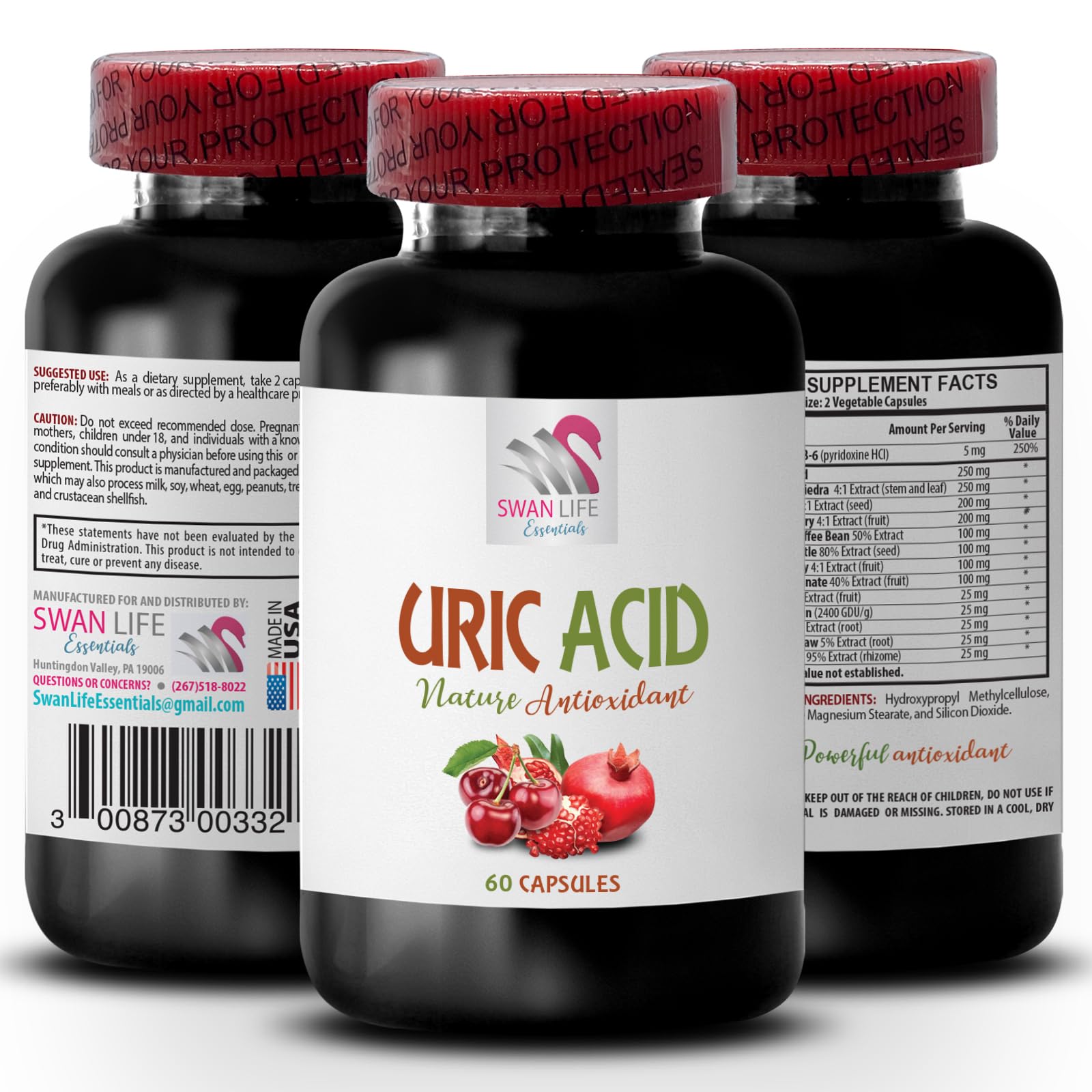 foods to reduce uric acid - URIC ACID - how to lower uric acid, how to reduce uric acid, pomegranate extract, tart cherry juice, tart cherry capsules, tart cherry extract, uric acid foods 1Bot 60CapsURIC ACID QUALITY ASSURANCE: Our Premium uric acid formula is made with the high-quality ingredients, Vegan, Non-Gmo, Gluten-free. This solution is safe and effective for your wellness. Manufactured in an NSF certified and GMP compliant facility, SWAN LIFE ESSENTIALS ensures strict adherence to quality standards throughout the production process. URIC ACID WITH MILK THISTLE: Our unique blend is providing a natural boost to your metabolism. Whether you're looking to support joint health or energy, or simply promote a healthier lifestyle, URIC ACID with MILK THISTLE is your go-to solution for optimal well-being. URIC ACID WITH GREEN COFFEE BEAN: Our supplement designed to support your body's overall wellness. This unique formula combines the powerful benefits of green coffee bean extract, known for its rich antioxidant properties, with ingredients that help maintain healthy uric acid. The green coffee beans are carefully selected and processed to retain their maximum potency. URIC ACID WITH TART CHERRY: Our unique blend combines science and nature to provide you with an effective, natural solution to maintain balanced uric acid. Embrace a healthier, more active lifestyle with URIC ACID with Tart Cherry — your ultimate ally for comfort. URIC ACID WITH POMEGRANATE: This premium supplement is crafted to support your body's natural ability to manage uric acid, promoting overall health and well-being. Infused with the potent benefits of pomegranate, a superfruit renowned for its powerful antioxidants, this formula not only aids in reducing oxidative stress. Experience natural relief and support for your body's uric acid with our premium URIC ACID with Cranberry, Pomegranate, Tart Cherry, Green Coffee Bean and Milk Thistle. Specially formulated with a blend of potent ingredients, including the powerful antioxidant properties, this supplement is designed to help maintain uric acid and support kidney.