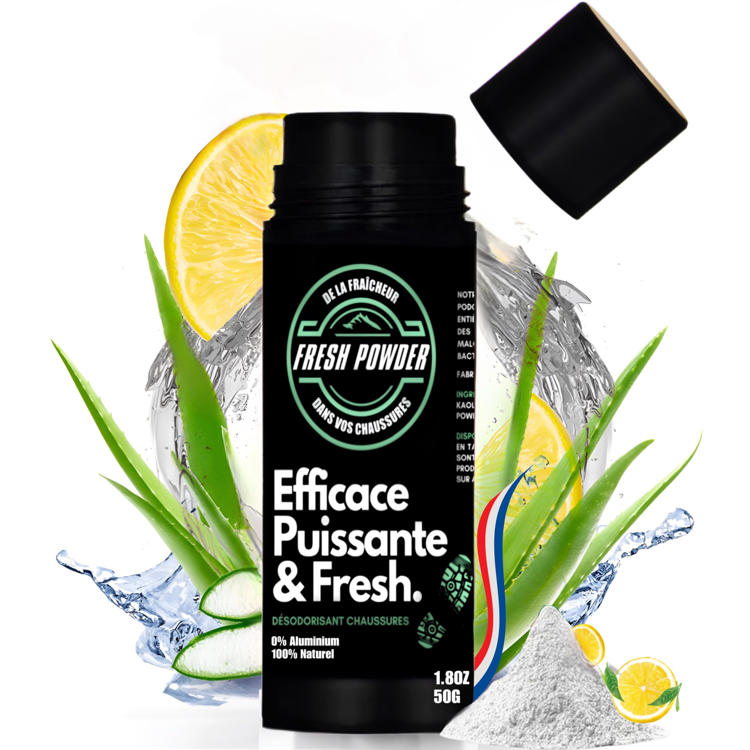 MADE IN FRANCE: Our odor-eliminating powder is proudly made in France with quality French ingredients. We use only natural and quality ingredients to ensure the best possible effectiveness of our product while respecting the environment and your health. FAST ACTING: Simply use our smelly feet treatment daily for one week, then apply it as needed. You will quickly see a significant improvement in the odor of your feet and shoes thanks to our effective formula. LONG-LASTING: Enjoy a long-lasting feeling of freshness with our long-lasting foot powder. Unlike other products, our powder does not degrade quickly and retains its odor-inducing properties for a long time. You will be able to enjoy effective odor protection for several hours. POWERFUL DEFENSE: Protect your skin with the clay and essential oil-based formula of our shoe deodorant. This natural substance provides effective protection against odor-causing bacteria and prevents the formation of fungus on the skin. This will keep your feet protected and healthy. NEUTRALIZES ODORS: Fresh Powder's natural odor eliminator effectively combats unpleasant foot and shoe odors by neutralizing odor-causing bacteria. Thanks to its natural formula, it effectively eliminates odors and leaves your feet feeling fresh for a long time.FABRIQUÉ EN FRANCE : Notre poudre pour éliminer les odeurs est fièrement fabriquée en France avec des ingrédients de qualité française. Nous utilisons uniquement des ingrédients naturels et de qualité pour garantir la meilleure efficacité possible de notre produit tout en respectant l'environnement et votre santé. ACTION RAPIDE : Il suffit d'utiliser notre traitement pour les pieds malodorants quotidiennement pendant une semaine, puis de l'appliquer selon les besoins. Vous constaterez rapidement une amélioration significative de l'odeur de vos pieds et de vos chaussures grâce à notre formule efficace. LONGUE DURÉE : Profitez d'une sensation de fraîcheur durable grâce à notre poudre pour pieds longue durée. Contrairement à d'autres produits, notre poudre ne se dégrade pas rapidement et conserve ses propriétés odoriférantes pendant une longue période. Vous pourrez ainsi profiter d'une protection efficace contre les odeurs pendant plusieurs heures. DÉFENSE PUISSANTE : Protégez votre peau grâce à la formule à base d'argile et d'huiles essentiels de notre déodorant pour chaussures. Cette substance naturelle offre une protection efficace contre les bactéries responsables des odeurs et prévient la formation de champignons sur la peau. Vos pieds seront ainsi protégés et sains. NEUTRALISE LES ODEURS : L'éliminateur d'odeurs naturel de Fresh Powder combat efficacement les odeurs désagréables de pieds et de chaussures en neutralisant les bactéries responsables des odeurs. Grâce à sa formule naturelle, il élimine efficacement les odeurs et laisse une sensation de fraîcheur durable sur vos pieds.
