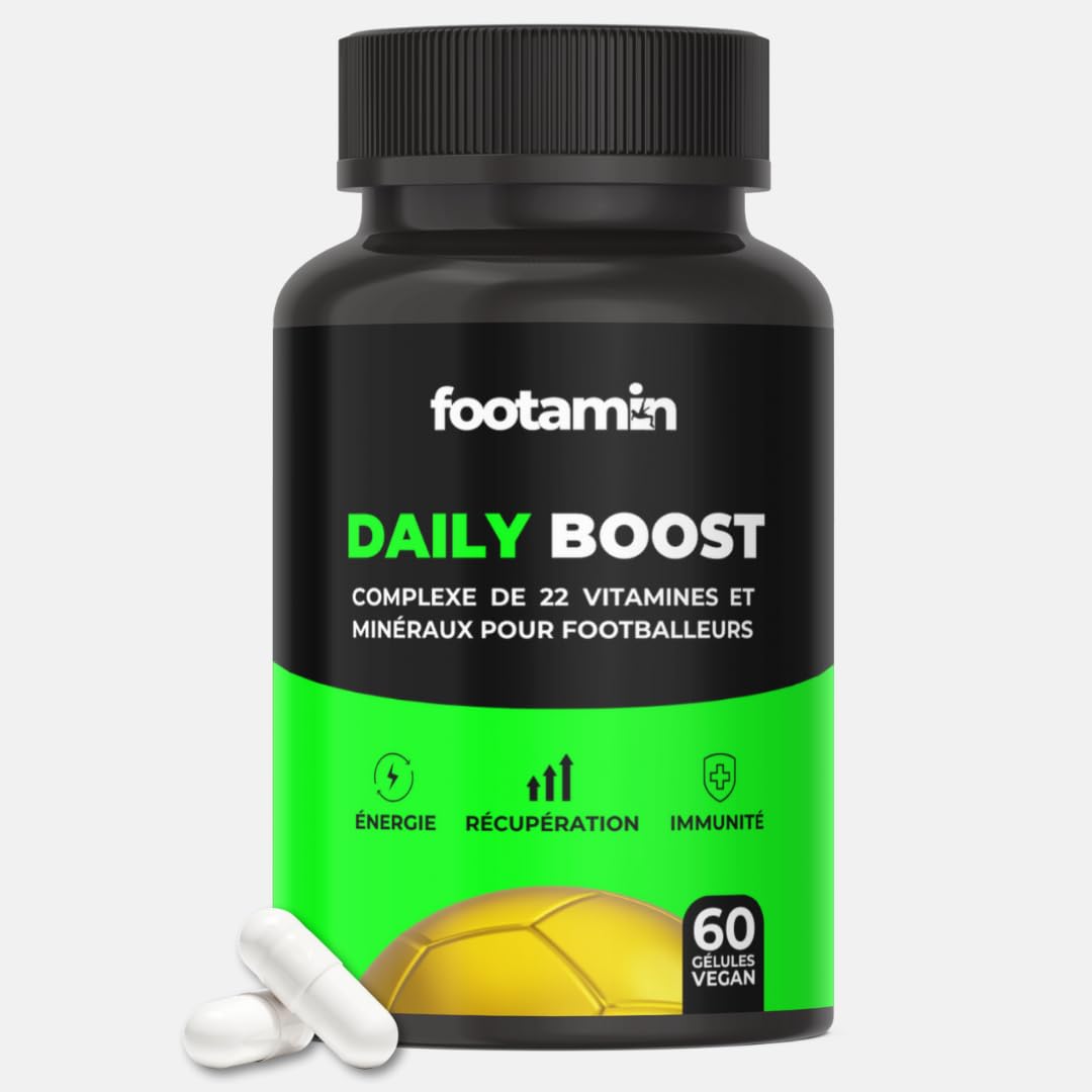 DAILY BOOST is a vitamin formula providing 100 of the reference intake of vitamins, supplemented with a range of essential minerals. 1 DAILY BOOST 60 capsules 30 doses. Vitamins A, B6, B12, C, D3, selenium, copper, and zinc contribute to the normal function of the immune system. Vitamins B2, B3, B5, B6, B12, C, D3, iron, and magnesium contribute to the reduction of tiredness and fatigue. Vitamins B1, B2, B3, B5, B8, B6, B12, iron, iodine, copper, magnesium, and manganese contribute to normal energy-yielding metabolism. Vitamins B2, C, E, manganese, selenium, and zinc contribute to the protection of cells from oxidative stress. Vitamin D3 and magnesium contribute to normal muscle function. Vitamin K2 MK-7 promotes strong bones and joints. Due to the considerable demands placed on their bodies and minds, footballers can benefit from regular vitamin and mineral supplementation. With this in mind, we decided to develop the ideal dietary supplement to meet the needs of all football players (amateurs, professionals, adults, and growing teenagers). Daily Boost is a completely vegan product, allergen-free and stimulant-free! INGREDIENTS Calcium carbonate, magnesium bisglycinate, vegan capsule, vitamin C (ascorbic acid), iodized kelp extract, zinc bisglycinate, anti-caking agent: magnesium stearate, bulking agent: microcrystalline cellulose, ferrous fumarate, vitamin E (dl-alpha-tocopheryl acetate), manganese glycinate, vitamin B3 (nicotinamide), selenium methionine, vitamin A (retinyl palmitate), vitamin K2 MK-7, vitamin B5 (calcium d-pantothenate), copper bisglycinate, vitamin B8 (biotin), vitamin D3 (cholecalciferol), vitamin B2 (riboflavin), vitamin B6 (pyridoxine hydrochloride), vitamin B1 (thiamine HCl), vitamin B9 (folic acid), chromium picolinate, vitamin B12 (methylcobalamin).✓ An innovative ally designed to improve football players' performance by optimizing their health. ✓ A vitamin-rich formula providing 100 of the recommended daily intake of vitamins. ✓ This product is completely vegan, allergen-free, and stimulant-free! ✓ DAILY BOOST is a food supplement developed by health and sports specialists. This complex of 13 vitamins and 9 minerals has been specially formulated for daily use by adults and growing teenagers.Multivitamines et Minéraux, Homme, Sport, Football, 100 AJR - Ado et Adultes 13 Vitamines et 9 Minéraux 60 gélules VEGAN Booste l'énergie et l'immunité Favorise la PerformanceDESCRIPTION DU PRODUIT DESCRIPTION DU PRODUIT DAILY BOOST est une formule vitaminée, fournissant 100 de l'apport de référence en vitamines, complétée par un ensemble de minéraux essentiels. 1 DAILY BOOST 60 gélules 30 doses Les vitamines A, B6, B12, C, D3, le sélénium, le cuivre et le zinc contribuent au fonctionnement normal du système immunitaire. Les vitamines B2, B3, B5, B6, B12, C, D3, le fer et le magnésium contribuent à la réduction de la fatigue. Les vitamines B1, B2, B3, B5, B8, B6, B12, fer, iode, cuivre, magnésium et manganèse contribuent à un métabolisme énergétique normal. Les vitamines B2, C, E, le manganèse, le sélénium et le zinc contribuent à la protection des cellules contre le stress oxydatif. La vitamine D3 et le magnésium contribuent au fonctionnement normal des muscles. La vitamine K2 MK-7 favorise le renforcement des os et des articulations. En raison des contraintes considérables imposées à leur corps et à leur mental, les footballeurs peuvent bénéficier d'un complément régulier en vitamines et minéraux. De ce constat, nous avons décidé d'élaborer le complément alimentaire idéal afin de répondre aux besoins de tous les joueurs de football (amateurs, professionnels, adultes et adolescents en pleine croissance). Daily Boost est un produit complètement vegan, sans allergène et sans stimulant ! INGRÉDIENTS Carbonate de calcium, bisglycinate de magnésium, gélule végane, vitamine C (acide ascorbique), extrait de varech iodé, bisglycinate de zinc, anti-agglomérant: Stéarate de magnésium, agent de charge: Cellulose microcristalline, fumarate ferraux, vitamine E (acétate de dl-alpha-tocophéryl), glycinate de manganèse, vitamine B3 (nicotinamide), méthionine de sélénium, vitamine A (palmitate de rétinyle), vitamine K2 MK-7, vitamine B5 (d-pantothénate de calcium), bisglycinate de cuivre, vitamine B8 (biotine), vitamine D3 (cholécalciférol), vitamine B2 (riboflavine), vitamine B6 (chlorhydrate de pyridoxine), vitamine B1 (thiamine HCL), vitamine B9 (acide folique), picolinate de chrome, vitamine B12 (méthylcobalamine).✓? Un allié innovant qui vise à améliorer les performances des joueurs de football grâce à l'optimisation de leur santé. ✓? Une formule vitaminée, fournissant 100 de l'apport de référence en vitamines. ✓ ?Il s'agit d'un produit complètement vegan, sans allergène et sans stimulant !. ✓? DAILY BOOST est un complément alimentaire élaboré par des spécialistes de la santé et du sport. Ce complexe de 13 vitamines et de 9 minéraux a été spécialement pensé pour une utilisation quotidienne adaptée aux adultes et aux adolescents en pleine croissance.