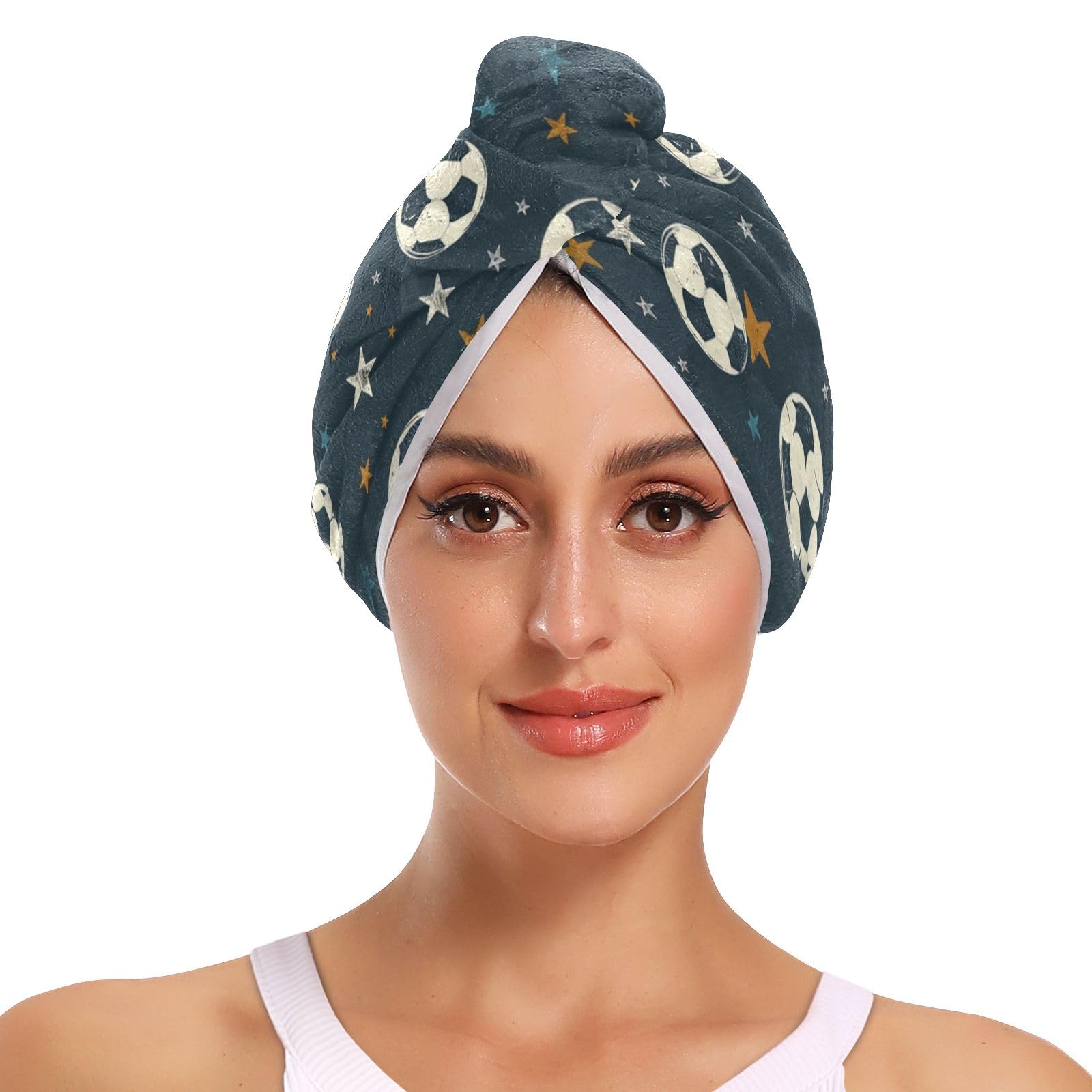 Footballs Stars Hair Towel 2 Pack Super Absorbent Hair Drying Towel Quick Dry Hair Turbans Head Towel with Button Twisty Wrap for Women Girls