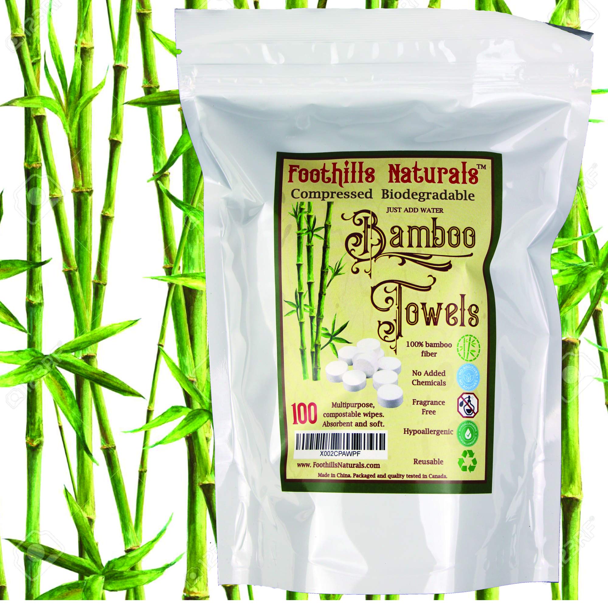 100 pieces compressed, BAMBOO FIBER, coin wipes– our MULTI-PURPOSE wipes are thick, VERY STURDY and REUSABLE. Suitable for sensitive baby skin as well as tough garage and kitchen messes. Easy to take on camping trips or keep in your baby's diaper bag.Foothills Naturals Bamboo fiber compressed towels are FRAGRANCE-FRRE, contain NO ADDED CHEMICALS. They are BIODEGRADABLE, HYPOALLERGENIC, and REUSABLE. Each towel reconstitutes instantly in water to a size of 12.2"x 8.7" , dries quickly and is SOFT, STRONG and ABSORBENT. The bamboo fiber is unbleached and dries to a very FLUFFY texture, suitable for delicate, sensitive skin. There are many pill towels out there we have taken the time to source more environmentally friendly fiber as well as make sure that the towels would withstand repeat use. To reduce waste they are packaged in a sturdy re-sealable bag and do not contain individual wrapping. If desired the towels can be washed a few times in a washing machine (cold water wash is preferable to avoid shrinking and faster disintegration). 100 pieces compressed, BAMBOO FIBER, coin towels – our MULTI-PURPOSE towels are thick, VERY STURDY and REUSABLE. Suitable for sensitive baby skin as well as tough garage and kitchen messes. Easy to take on camping trips or keep in your baby's diaper bag.