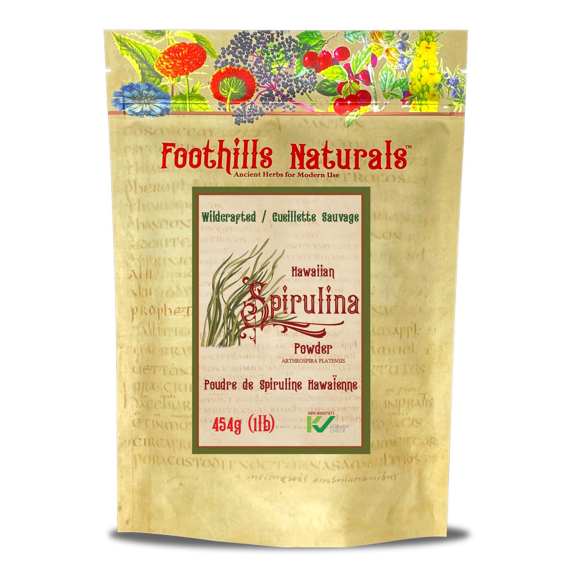 Foothills Naturals Hawaiian Spirulina powder 1 pound (454g) Hawaiian Spirulina Powder – Over 200 servings , contains carefully selected strain of Arthrospira Platensis, developed over many years of cultivation in Hawaii. It is packaged immediately in vacuum sealed pouches in order to preserve potency and avoid oxidation. Our spirulina cotains NO-ADDITIVES. TASTE: Spirulina powder has deep green colour with light sea smell and earthy with slightly sulphuric edge taste. It is suitable for use both as a super-food and nutritional supplement. AS SUPER-FOOD it is consumed for its many health benefits. It is easy to add to smoothies, salads, soups, to be mixed into energy balls and added to nutritional drinks and vegetable juices. Source of ANTI-OXIDANTS Harvested and dried in a state of the art facilities minimizing oxidation and damage to the fragile nutrients. Certified KOSHER. NON-GMO. It has undergone quality and purity testing in Canada.Kosher. Non GMO. No Additives. No Preservatives. Suitable for the preparation of functional food and beverages. 454g 1 pound - Hawaiian Spirulina Powder.