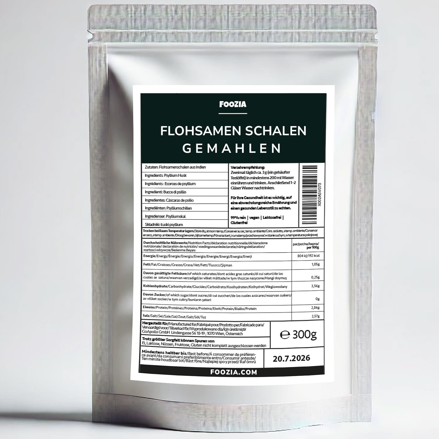 Ground Psyllium Husks 300g, min. 95 pure, vegan, and lab-tested. Natural and versatile – Cooking, baking, binding, health. Psyllium husk, also known as Psyllium Husk or Ispaghula Husk, is obtained from the seeds of the Plantago ovata plant. This plant belongs to the plantain family and is often used for its high fiber content. Versatile use in cooking baking, for health purposes, and 100 natural and vegan. Our ground psyllium husks have a wide range of applications, making them ideal for meat-free cooking as well. Product Information: Ingredients: Ground psyllium husks Contents: 300g Processing: Natural and vegan – No additives. Lab-tested: Yes Bottled in Austria, Origin: India and surrounding areas Dosage: According to recipe application. The recommended dosage depends on each use. Areas of use: Thickener. Binder: Health (various uses) Cooking Cooking soups. Sauces. etc. Indications: Vegan. Natural INGREDIENTS Ground psyllium husksVEGAN: Our psyllium husk powder is 100 vegan – of the highest food-grade quality, multi-purpose, a true all-rounder in the kitchen. ? CONTROLLED: Our ground psyllium husks are lab-tested and carefully packaged in Austria for maximum quality and safety. ? German Supplier: Our ground psyllium husks are sourced exclusively from a certified supplier based in Germany. Uses: Ideal for baking, cooking, thickening, smoothies, as a thickener binder, and for health benefits. CONTENTS QUALITY: 300g of psyllium husk powder, min. 95 pure, premium food-grade.Coquilles de psyllium moulues 300 g de poudre de psyllium husk poudre de psyllium farine de psyllium husk farine de psyllium husk poudre de Foozia 300gDESCRIPTION DU PRODUIT DESCRIPTION DU PRODUIT Coquilles de psyllium moulues 300 g, min. 95 pure, végétalien et testé en laboratoire. Naturel et polyvalent – Cuisine, pâtisserie, liant, santé. La coquille de psyllium ou aussi appelée Psyllium Husk ou Ispaghula Husk, est obtenue à partir des graines de la plante Plantago ovata. Cette plante appartient à la famille des plantains et est souvent utilisée pour sa teneur élevée en fibres. Utilisation polyvalente en cuisine pâtisserie, à des fins de santé et 100 naturel et végétalien. Nos coquilles de psyllium moulues ont un large éventail d'applications, ce qui les rend également idéales pour la cuisine sans viande. Informations produit : Ingrédients : coquilles de psyllium moulues Contenu : 300 g Traitement : naturel et végétalien – Sans additifs additifs. Testé en laboratoire : testé en laboratoire. Mise en bouteille : Autriche, Origine : Inde et environs Dosage : selon recette application. Le dosage recommandé dépend de chaque utilisation. Domaines d'utilisation : épaississant. Liant : Santé (diverses utilisations) Cuisson Cuisson soupes. sauces. etc. Indications : Végétalien. Naturel INGRÉDIENTS Coquilles de psyllium mouluesVEGAN : notre poudre d'enveloppe de psyllium est 100 végétalienne – dans la meilleure qualité alimentaire, multi-usage, une véritable cuisine polyvalente. ? CONTRÔLE : nos enveloppes de psyllium moulues sont testées par un laboratoire et soigneusement conditionnées en Autriche pour une qualité et une sécurité maximales. ? Fournisseur allemand : nos enveloppes de psyllium moulues sont achetées sans exception auprès d'un fournisseur certifié et basé en Allemagne. Utilisation : idéal pour la pâtisserie, la cuisine, l'épaississement, les smoothies, comme épaississant liant ainsi que pour la santé. CONTENU QUALITÉ : 300 g de poudre d'enveloppe de psyllium min. 95 pur de qualité supérieure qualité alimentaire.