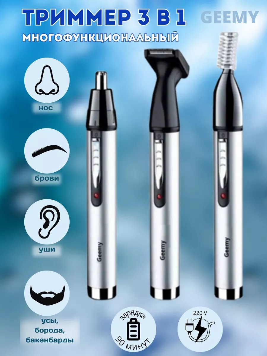 Универсальный **триммер** для удаления нежелательных волос.Модная стрижка, линия бровей, мужская бородка или усы требуют корректировки уже через пару недель после ухода.Чтобы не посещать парикмахерскую, либо салон красоты для моделированиярастительности на лице, коррекции линии стрижки, приобретите полезный инструмент триммер для бороды, носа и висков.**Триммер** это электроустройство небольших размеров, предназначенное для подстригания бороды, усов, бровей и для укорачивания или удаления волосков в носу, ушах.Высокая скорость мотора триммера, бесшумность, эргономичность и модный дизайн сделают ваш уход за внешностью приятным занятием.Невероятно легкий триммер с мощным мотором обеспечит мягкое деликатное удаления волос в не нужном для вас месте.Универсальный гигиенический триммер для удаления волос оснащен двумя съемными насадками для носа и ушей, подравнивания бороды и усов. Работает от встроенного аккумулятора. Заряжается от сети.