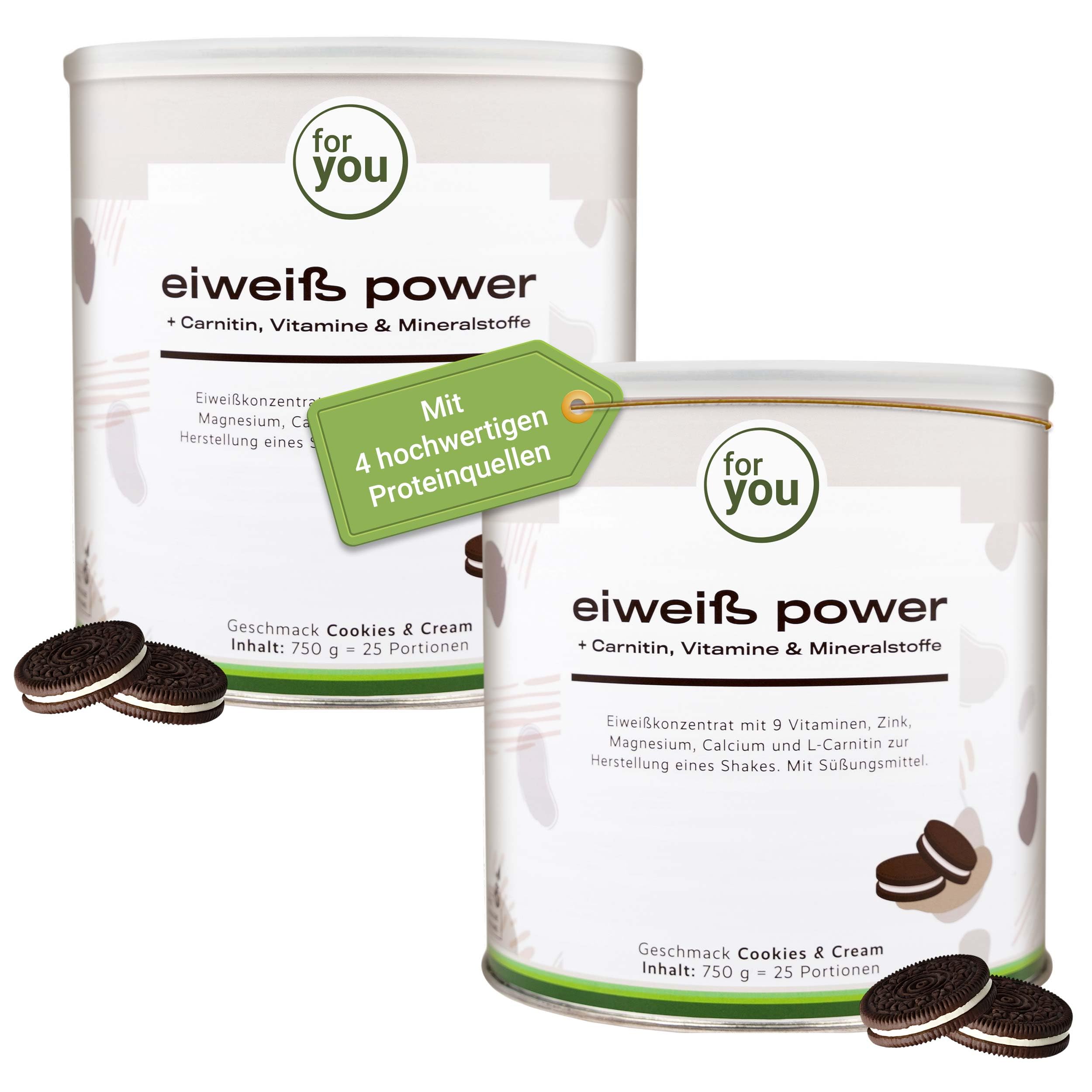 This is a blend of four very high-quality, organically selected protein sources (milk, soy, whey, and egg). Each of the four components of for you Eiweiß power has different proportions of essential amino acids. The optimal combination of the different proteins increases the biological value. The chemical score is 156. for you eiweiß power is a very high-quality and delicious protein blend suitable for athletes and people who want to eat healthy, protein-rich foods. INGREDIENTS Milk proteins, soy protein isolate, whey protein concentrate (contains emulsifier lecithin (sunflower)), low-fat cocoa powder (6.4 ), flavoring, L-carnitine, chicken egg protein powder, magnesium carbonate, vitamin C, zinc citrate, vitamin E, sweetener, sucralose, niacin, pantothenic acid, vitamin B6, vitamin B2, vitamin B1, folic acid, vitamin B12. INSTRUCTIONS FOR USE Each serving contains 200 ml of cold water or milk. Pour into a mixing bowl, add 30 g of powder (2 heaped tablespoons) and shake well for 20 seconds. Alternatively, prepare using an electric mixer. SAFETY WARNING This product is not a substitute for a balanced and varied diet and a healthy lifestyle. See morefor you YOUR HEALTH PARTNER Our quality promise guarantees high-quality nutritional supplements made from carefully selected raw materials, ecologically packaged, and manufactured according to the highest German quality standards. We are certified organic and therefore operate according to the highest quality standards. Secret proteins: Our protein powder is developed according to "The New Dr. Strunz Diet" and relies only on the finest and purest raw materials. Perfectly suited for a low-carb diet following the cookbook. Added nutrients: The protein powder is enriched with vitamins and minerals, as well as microencapsulated L-carnitine. The fitness powder is particularly distinguished by its 80 protein content. 4-component protein powder for you. Thanks to four high-quality protein sources—milk protein, whey protein, soy protein isolate, and chicken egg powder—the powder is highly soluble, easy to digest, low in fat, and delicious. Multi-component protein: This 4-component protein powder, with its balanced ratio of all amino acids, is suitable as a sports food and protein shake. It is low in fat, highly soluble, and easy to digest. Chemical score of 156.Lot de 2 poudres de protéines Power selon Dr. Strunz 2 x 750 g – Protéines multi-composants hautement solubles : lactosérum, protéines de soja, de lait, d'œuf de poule L-carnitine – Score chimique Cookies et crèmeDESCRIPTION DU PRODUIT DESCRIPTION DU PRODUIT Il s'agit d'un mélange de 4 sources de protéines sélectionnées biologiquement de très haute qualité (lait, soja, lactosérum et œuf). Chacun des quatre composants du for you Eiweiß power a différentes proportions d'acides aminés essentiels. La combinaison optimale des différentes protéines augmente la valeur biologique. Le score chimique est de 156. for you eiweiß power est un mélange de protéines de très haute qualité et savoureux adapté aux athlètes et aux personnes qui veulent manger des aliments riches en protéines et sains. INGRÉDIENTS protéines de lait, isolat de protéines de soja, concentré de protéines de lactosérum (contient émulsifiant lécithine (tournesol)), poudre de cacao faible en gras (6,4 ), arôme, L-carnitine, poudre de protéines d'œuf de poule, carbonate de magnésium, vitamine C, citrate de zinc, vitamine E, édulcorant, sucralose, niacine, acide pantothénique, vitamine B6, vitamine B2, vitamine B1. Acide folique, vitamine. B12. MODE D'EMPLOI Chaque portion contient 200 ml d'eau froide, ou du lait, verser dans un bol mélangeur, ajouter 30 g de poudre ( 2 cuillères à soupe bombées) et bien agiter pendant 20 secondes. La préparation peut également être effectuée avec un mixeur électrique. AVERTISSEMENT DE SÉCURITÉ Ce produit ne remplace pas une alimentation équilibrée et variée et un mode de vie sain. Voir plusfor you DEIN GESUNDHEITSPARTNER Unser Qualitätsversprechen garantiert hochwertige Nahrungsergänzungsmittel, aus sorgfältig ausgewählten Rohstoffen, ökologisch verpackt, hergestellt nach höchsten deutschen Qualitätsstandards. Nous sommes certifiés bio et travaillons donc selon les normes de qualité les plus élevées. Protéines secrètes : notre poudre de protéines est développée selon « Le nouveau régime de Dr. Strunz » et ne parie que sur les meilleures et les plus pures matières premières I Parfaitement adaptée pour un régime suivant le livre de cuisine à faible teneur en glucides. Nutriments ajoutés : la poudre de protéines est enrichie en vitamines et minéraux ainsi qu'en L-carnitine microencapsulée. La poudre de fitness se distingue surtout par sa teneur en protéines de 80 . Poudre de protéines for you à 4 composants. Grâce aux quatre sources de protéines de qualité supérieure : protéines de lait, protéines de lactosérum, isolat de protéines de soja et poudre d'œuf de poule, la poudre est bien soluble, facile à digérer, faible en gras et savoureuse. Protéines multi-composants : la protéine for you à 4 composants avec une comptabilité équilibrée de tous les acides aminés convient comme nourriture sportive et shake protéiné. Elle est pauvre en graisses, bien soluble et facile à digérer. Score chimique de 156.