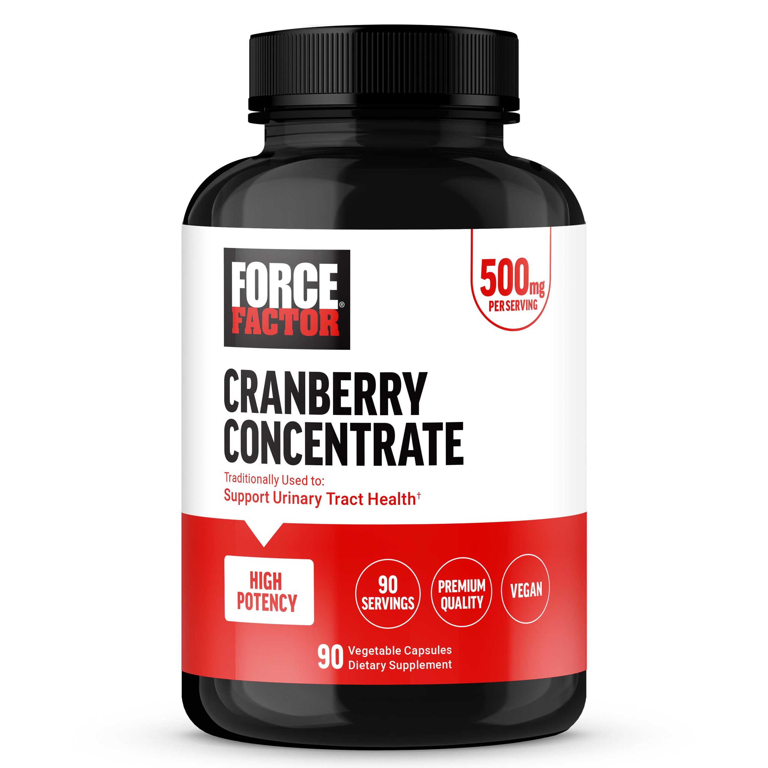 MADE IN THE USA: Force Factor Cranberry Concentrate is made in America in GMP-certified manufacturing facilities to ensure quality and safety. All of our ingredients go through rigorous testing to validate their potency and purity. PREMIUM QUALITY VEGAN FRIENDLY: With no artificial colors, artificial flavors, or gelatin, you can rest assured that you're choosing high-quality, better-for-you cranberry pills to support urinary tract health for women and men. 90-DAY SUPPLY: With just a single high-potency dose per day, one bottle of Force Factor cranberry pills for women and men is an excellent value for a three month supply. Add to cart now!. HIGH-POTENCY FORMULA: Every serving delivers a high-potency 500mg dose of pure cranberry powder for maximum effectiveness to support your urinary health. SUPPORTS URINARY TRACT HEALTH: Force Factor Cranberry Concentrate Capsules provide pure cranberry extract, traditionally used to promote urinary tract health.
