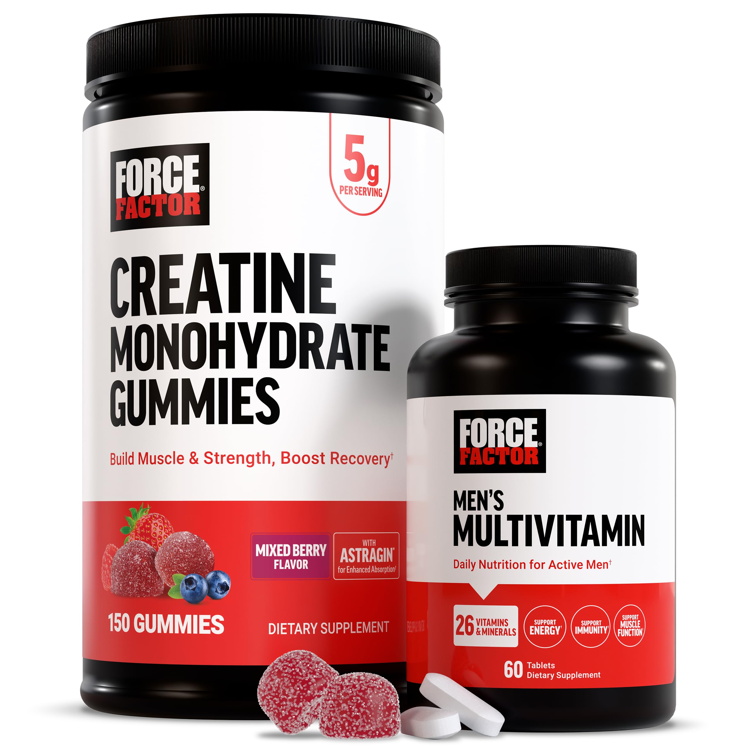 Bundle of Force Factor Creatine Gummies, 5 Grams Creatine Monohydrate for Muscle Gain, More Strength, and Faster Recovery, Mixed Berry, 150 Gummies, 30 Servings Force Factor Men's Multivitamins, Multivitamin for Men Plus Amino Acids Supplement with 27 Vitamins and Minerals, and Phytonutrients to Support Energy, and Immunity, 60 TabletsMADE IN THE USA: Force Factor Men's Multivitamin is made in America in GMP-certified manufacturing facilities to ensure quality and safety. All of our ingredients go through rigorous testing to validate their potency and purity. MADE IN THE USA: Force Factor Creatine Gummies are made in America in GMP-certified manufacturing facilities to ensure quality and safety. All of our ingredients go through rigorous testing to validate their potency and purity. PREMIUM QUALITY: With no artificial colors, artificial flavors, or gelatin, you can rest assured that you're choosing a high-quality, better-for-you men's multivitamin supplement to support your daily health and wellbeing. Packaging may vary. PROVIDES ESSENTIAL PROSTATE SUPPORT: Each daily serving contains saw palmetto, a potent plant-based ingredient widely used in traditional medicine to support prostate health. CLINICALLY STUDIED 5g DOSE THIRD PARTY TESTED: Don't be fooled by underdosed creatine chews. Force Factor Creatine Gummies are the real deal, third-party tested to ensure the clinically proven 5g dose per serving. CONTAINS 8 AMINO ACIDS: More than just your average men's multivitamins, Force Factor Men's Multivitamin contains a potent blend of eight amino acids, the building blocks of muscle and an essential part of a healthy, active lifestyle. ABSORBS FASTER THAN REGULAR CREATINE: Force Factor Creatine Gummies are formulated with AstraGin, a patented ginseng extract that enhances and accelerates creatine absorption for more effective results. POWERFUL DAILY SUPPORT FOR ACTIVE MEN: Work, workouts, and daily life can take a lot out of you. Take it back with Force Factor Men's Multivitamin. Every daily dose nourishes your mind and body to help you live life with more energy and vitality. HELPS BUILD LEAN MUSCLE STRENGTH: Every serving of these powerful creatine gummies fuels your athletic performance. By increg energy production in your muscles, it helps you train harder, lift heavier, and recover faster.