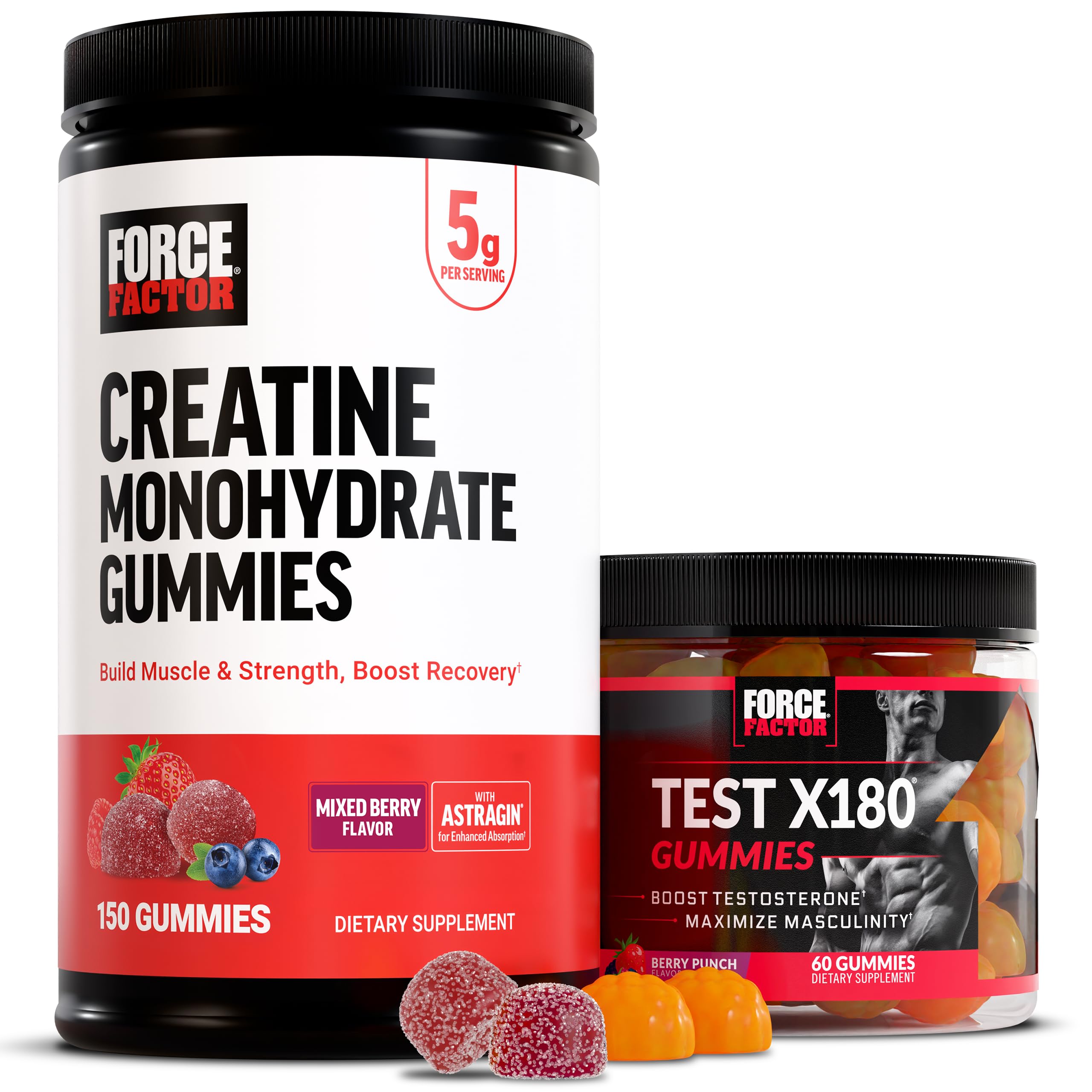 Bundle of Force Factor Creatine Gummies, 5 Grams Creatine Monohydrate for Muscle Gain, More Strength, and Faster Recovery, Mixed Berry, 150 Gummies, 30 Servings Force Factor Test X180 Gummies Testosterone Booster for Men with Tongkat Ali, Horny Goat Weed, Tribulus Terrestris, Fenugreek, Black Maca, Supplement Men, Berry Punch, 60 Gummies, 1-PackSTRONG EFFECTIVE: Test X180 Gummies prime your body to boost testosterone naturally, helping you achieve new levels of masculinity. Every serving contains a scientifically tested ingredient shown to support testosterone levels. MADE IN THE USA: Force Factor Creatine Gummies are made in America in GMP-certified manufacturing facilities to ensure quality and safety. All of our ingredients go through rigorous testing to validate their potency and purity. LOADED WITH MALE VITALITY INGREDIENTS: This testosterone supplement is loaded with traditional ingredients like boron, fenugreek, black maca, Tribulus terrestris, tongkat ali, and horny goat weed, providing you with complete male health support. DELICIOUS CONVENIENT GUMMIES: Power up in the most delicious way imaginable. Sweet and full of flavor, Creatine Gummies are a new and convenient way to get the benefits of creatine without messy powders or mixing. GREAT-TASTING WITH NOTHING TO HIDE: Bursting with flavor, and made without artificial colors, artificial sweeteners, or preservatives, these testosterone gummies for men provide everything you want in a testosterone booster, and nothing you don't. CLINICALLY STUDIED 5g DOSE THIRD PARTY TESTED: Don't be fooled by underdosed creatine chews. Force Factor Creatine Gummies are the real deal, third-party tested to ensure the clinically proven 5g dose per serving. Just two great-tasting gummies is all it takes to flood your bloodstream with the scientifically tested ingredient your body uses to boost testosterone. No matter where life takes you, a daily dose of Test X180 Gummies is an easy way to level up your masculinity so you can fully Unleash Your Potential. HELPS BUILD LEAN MUSCLE STRENGTH: Every serving of these powerful creatine gummies fuels your athletic performance. By increg energy production in your muscles, it helps you train harder, lift heavier, and recover faster. ULTIMATE CONVENIENCE: Living a high performance life means you're always on the move. Whether you're at work, on campus, or headed to the gym, Test X180 Gummies are a delicious and easy way to boost testosterone for the ultimate in convenience. ABSORBS FASTER THAN REGULAR CREATINE: Force Factor Creatine Gummies are formulated with AstraGin, a patented ginseng extract that enhances and accelerates creatine absorption for more effective results.