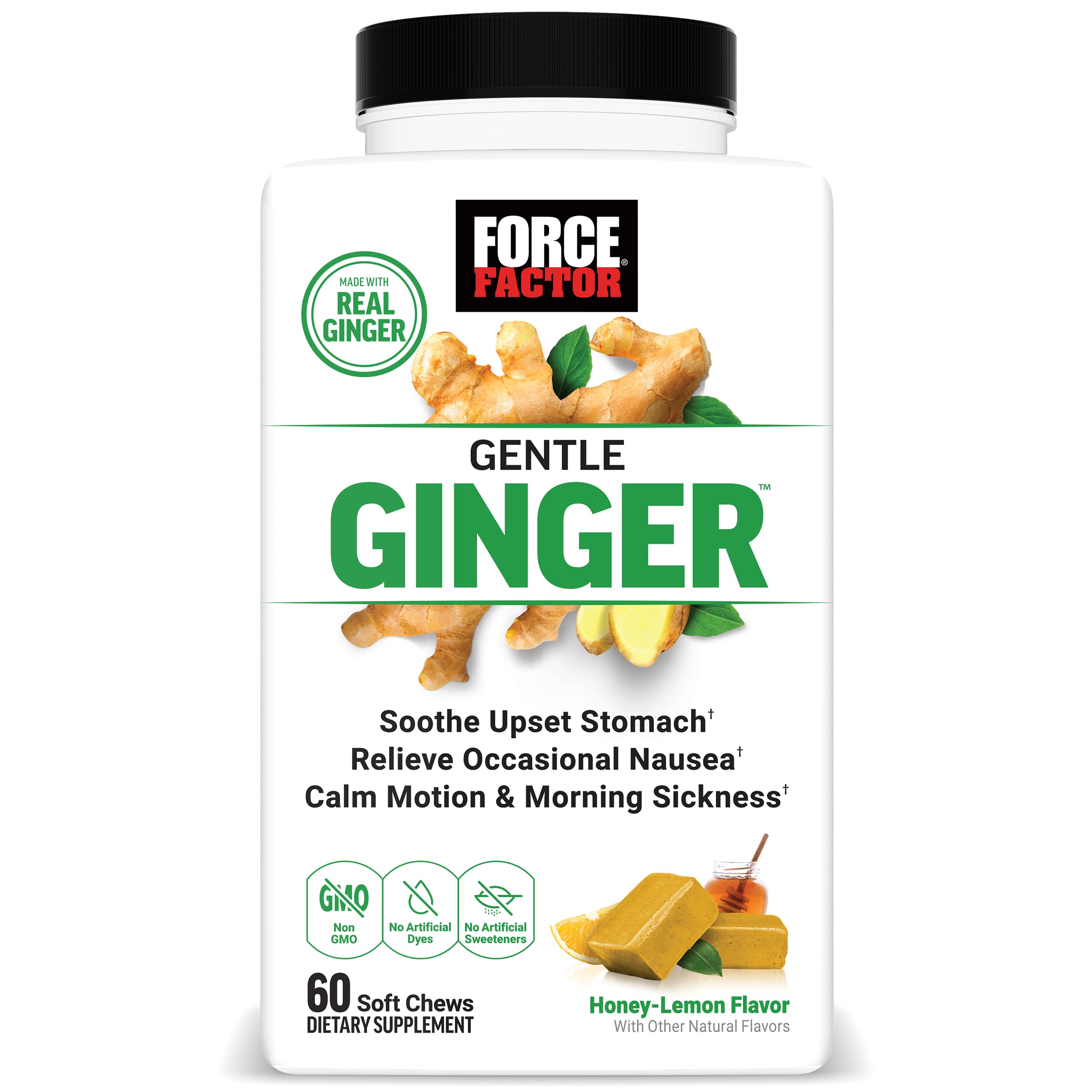 DELICIOUS INDIVIDUALLY WRAPPED: Say goodbye to messy ginger powder or sour ginger shots. Force Factor Gentle Ginger Soft Chews are full of honey-lemon flavor, individually wrapped for cleanliness and convenience. ENHANCED WITH VITAMIN B6: These powerful ginger chews are fortified with vitamin B6 to maximize their nausea-calming benefits and promote overall wellbeing. MADE WITH REAL GINGER: Packed with 250mg of real ginger, every delicious chew delivers the natural power of ginger to soothe your stomach and provide gentle relief. Click add to cart and try them today!. PERFECT FOR TRAVEL MOTION SICKNESS: Force Factor Gentle Ginger Soft Chews are easy to take on the go, making them a travel essential for those who get queasy on road trips, flights, or boat rides. PROVIDES NATURALLY POWERFUL NAUSEA RELIEF: Force Factor Gentle Ginger Soft Chews are infused with real ginger, specially formulated to relieve occasional nausea and morning sickness.