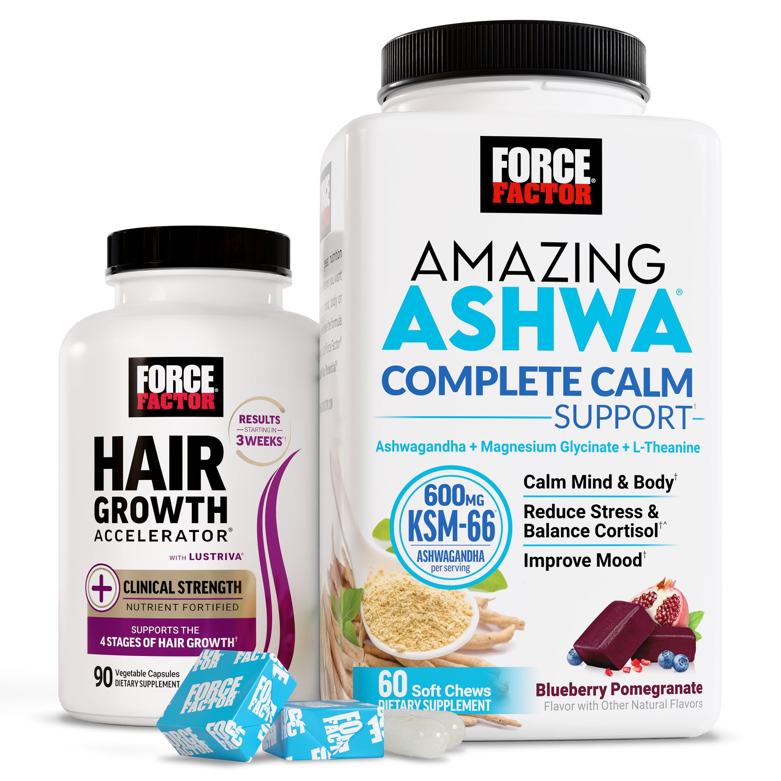 Bundle of Force Factor Hair Growth Accelerator Capsules, Hair Growth Vitamins for Women Men with Clinically Proven Lustriva Biotin to Support Healthy Hair, Reduce Fine Lines Wrinkles, 90 Capsules FORCE FACTOR Amazing Ashwa Complete Calm Support with KSM-66 Ashwagandha, Like Ashwangandha Gummies to Promote Calm Relaxation with Magnesium L-Theanine, Blueberry Pomegranate, 60 Soft ChewsFEEL MORE RELAXED: With its unique blend of calming ingredients like KSM-66 Ashwagandha, magnesium, and L-theanine, this powerful formula is a great way to feel more calm during the day, or as a way to unwind at night. PREMIUM QUALITY MADE IN THE USA: Hair Growth Accelerator is made in America using globally sourced ingredients. Produced in GMP-certified manufacturing facilities, all ingredients go through rigorous testing to validate their potency and purity. REDUCE CORTISOL LEVELS BY 28 : KSM-66 Ashwagandha is shown in a clinical study to reduce serum cortisol levels by 28 , with users reporting a better sense of well-being and improved quality of life. . REDUCE FINE LINES WRINKLES: Every dose helps to diminish the appearance of fine lines and wrinkles, enhancing skin's natural radiance and elasticity promoting a firmer, smoother complexion that visibly defies the signs of aging. DELICIOUS CONVENIENT SOFT CHEWS: Amazing Ashwa Complete Calm Support Soft Chews in Blueberry Pomegranate flavor taste amazing and come individually wrapped for the ultimate in convenience, with no mess. Just grab and go. CONTAINS CLINICALLY PROVEN LUSTRIVA – RESULTS STARTING IN 3 WEEKS!: Lustriva is a superior form of biotin and silicon 40x more soluble than regular biotin, proven in scientific studies to increase hair thickness starting in as little as 3 weeks. MADE IN THE USA THIRD-PARTY TESTED: Force Factor Amazing Ashwa Complete Calm Support is made in America using globally sourced ingredients in GMP-compliant manufacturing facilities. All ingredients go through rigorous testing to validate their quality, potency, and purity. SUPPORT 4 STAGES OF HAIR GROWTH: Clinical strength formula fortified with vitamins D E, collagen, biotin, ashwagandha, saw palmetto, horsetail (silica), and other key nutrients to support all 4 stages of hair growth – from development to shedding. PROMOTE CALM WITH KSM-66 ASHWAGANDHA: Amazing Ashwa Complete Calm Support delivers KSM-66 Ashwagandha, the gold-standard adaptogen for calm and relaxation. Perfect for those seeking ashwagandha gummies or magnesium ashwagandha in a convenient soft chew. PROMOTE THICKER, FULLER, HEALTHIER HAIR: Hair Growth Accelerator is a revolutionary new formula designed to rapidly improve the health, strength, thickness, and growth of new hair.