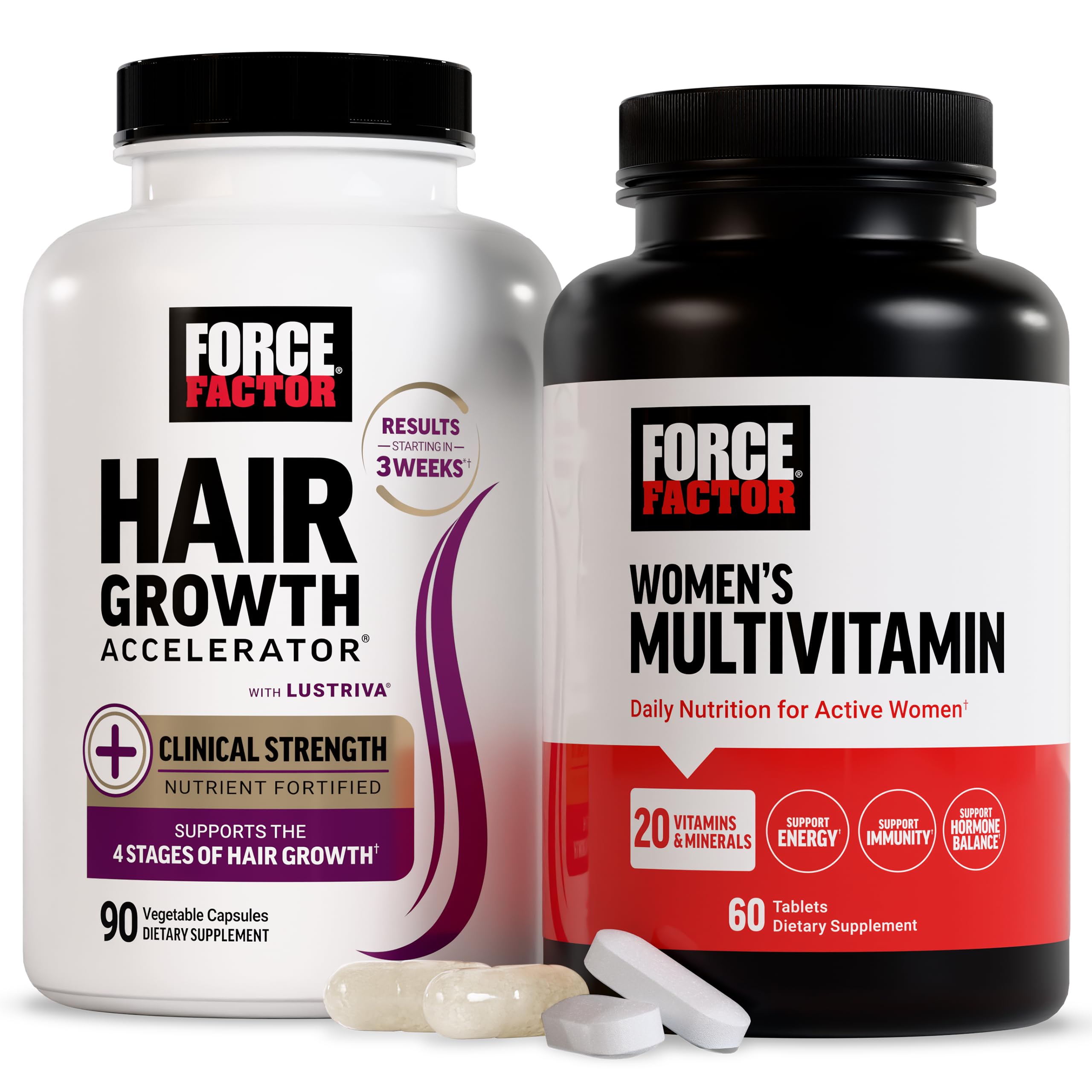 Bundle of FORCE FACTOR Hair Growth Accelerator Capsules, Lustriva Biotin to Promote Thicker, Stronger, Fuller Hair, Women Hair Growth Vitamins, Clinically Studied, Supports All 4 Stages of Growth, 90ct Force Factor Women's Multivitamin, Multivitamin for Women to Support Hormone Balance, Energy, Immunity, and Gut Health, with 20 Vitamins Minerals, Ashwagandha, Chasteberry, and More, 60 TabletsPREMIUM QUALITY MADE IN THE USA: Hair Growth Accelerator is made in America using globally sourced ingredients. Produced in GMP-certified manufacturing facilities, all ingredients go through rigorous testing to validate their potency and purity. MADE IN THE USA: Force Factor Women's Multivitamin is made in America in GMP-certified manufacturing facilities to ensure quality and safety. All of our ingredients go through rigorous testing to validate their potency and purity. REDUCE FINE LINES WRINKLES: Every dose helps to diminish the appearance of fine lines and wrinkles, enhancing skin's natural radiance and elasticity promoting a firmer, smoother complexion that visibly defies the signs of aging. PREMIUM QUALITY: With no artificial colors, artificial flavors, or gelatin, you can rest assured that you're choosing a high-quality, better-for-you multivitamin for women to support your active, healthy lifestyle. CONTAINS CLINICALLY PROVEN LUSTRIVA – RESULTS STARTING IN 3 WEEKS!: Lustriva is a superior form of biotin and silicon 40x more soluble than regular biotin, proven in scientific studies to increase hair thickness starting in as little as 3 weeks. PROMOTES HOLISTIC HEALTH: With a comprehensive blend of essential vitamins and minerals, this potent women's multivitamin has been formulated to support everything from energy and immunity, to hormone balance and gut health. SUPPORT 4 STAGES OF HAIR GROWTH: Clinical strength formula fortified with vitamins D E, collagen, biotin, ashwagandha, saw palmetto, horsetail (silica), and other key nutrients to support all 4 stages of hair growth – from development to shedding. CONTAINS 20 ESSENTIAL VITAMINS MINERALS: Formulated specifically for the needs of active women, every daily serving of Force Factor Women's Multivitamin contains 13 essential vitamins and 7 essential minerals to support your daily well-being. PROMOTE THICKER, FULLER, HEALTHIER HAIR: Hair Growth Accelerator is a revolutionary new formula designed to rapidly improve the health, strength, thickness, and growth of new hair.