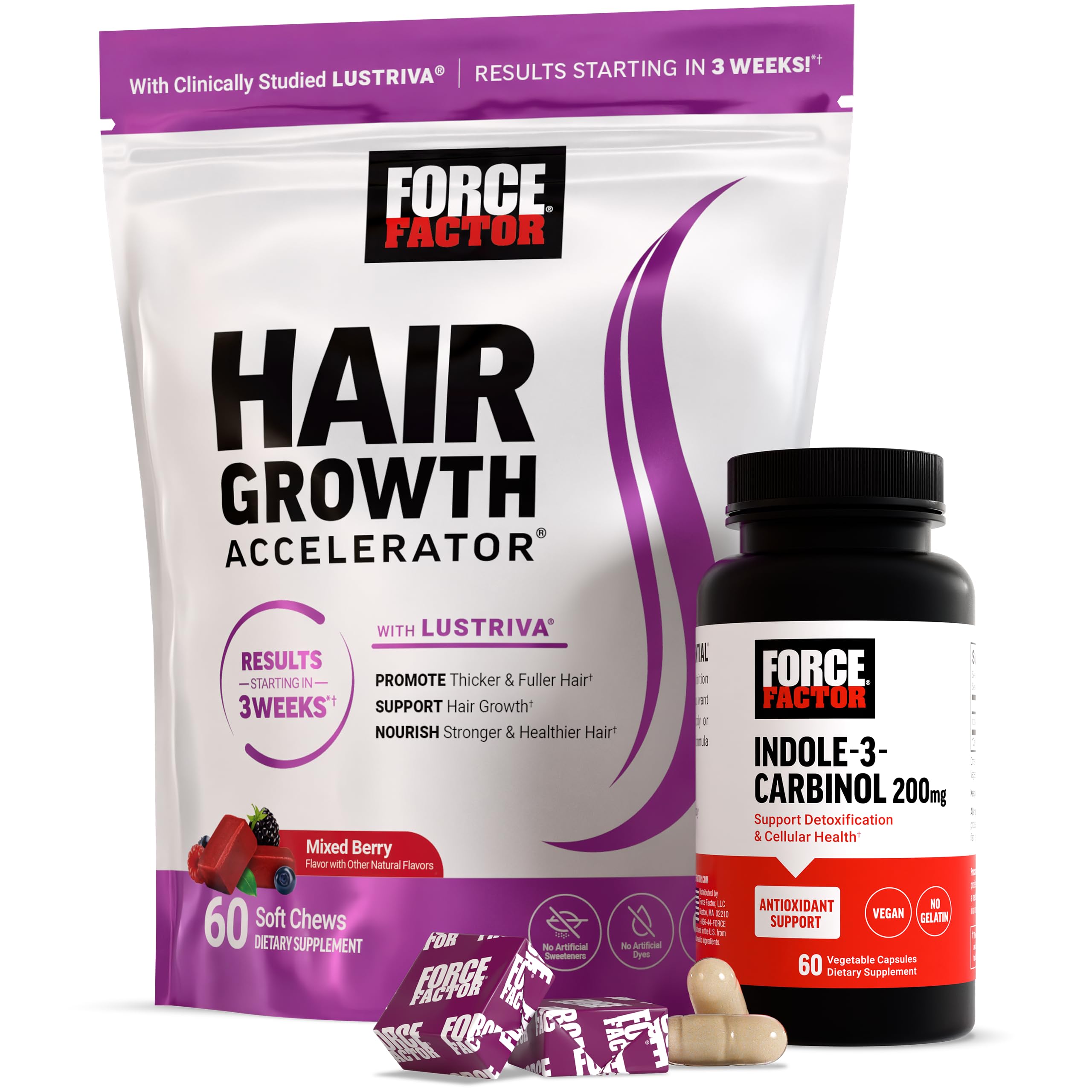 Support your beauty and wellness from the inside out with Force Factor Hair Growth Accelerator. This comprehensive hair growth multivitamin formula delivers essential vitamins—A, B12, C, D, and E—plus collagen, biotin, and key superfoods to promote fuller hair, healthier nails, and more radiant skin. Fortified with clinically studied Lustriva, a superior biotin and silicon complex that's 40X more soluble than standard biotin, this advanced blend has been shown to increase hair thickness starting in as little as 3 weeks. It also supports all 4 stages of hair growth—development, transition, rest, and shedding—with targeted nutrients like collagen, saw palmetto, and horsetail. This powerful daily multivitamin also helps reduce the appearance of fine lines and wrinkles, for healthier skin and a smoother complextion. Made in the USA in GMP-compliant facilities, every ingredient is rigorously tested for purity and potency to ensure the highest quality. In a clinical study by Kalman et al. (2021), results showed a significant increase in hair thickness in the Lustriva group, a key ingredient in Hair Growth Accelerator, compared to the placebo at Week 3. These statements have not been evaluated by the Food and Drug Administration. This product is not intended to diagnose, treat, cure, or prevent any disease. Elevate your wellbeing with Force Factor Indole 3 Carbinol, known as "nature's detoxifier." This premium supplement is meticulously formulated to boost your body's natural detoxification process, promoting daily liver detoxification and inner balance. By harnessing the power of indole 3 carbinol, it helps regulate estrogen levels and supports healthy hormone balance in both men and women, offering a holistic approach to wellness.SUPPORTS HEALTHY ESTROGEN AND HORMONE BALANCE: With every dose, indole 3 carbinol helps regulate estrogen levels and maintain healthy hormone balance in both men and women. PROMOTE THICKER, FULLER, HEALTHIER HAIR: Hair Growth Accelerator is a revolutionary new formula designed to rapidly improve the health, strength, thickness, and growth of hair. BOOSTS NATURAL DETOXIFICATION: Known as "nature's detoxifier", Force Factor Indole-3-Carbinol helps rejuvenate your body, formulated to promote daily liver detoxification and inner balance. PREMIUM QUALITY MADE IN THE USA: Force Factor Hair Growth Accelerator is made in America in GMP-compliant manufacturing facilities to ensure quality and safety. All our ingredients go through rigorous testing to validate their potency and purity. PREMIUM QUALITY VEGAN FRIENDLY: With no artificial colors, artificial flavors, or gelatin, you can rest assured that you're choosing a high-quality, better-for-you indole 3 carbinol supplement to support your health and wellbeing. In a clinical study by Kalman et al. (2021), results showed a significant increase in hair thickness in the Lustriva group compared to the placebo at Week 3. MADE IN THE USA: Force Factor Indole 3 Carbinol 200mg is made in America in GMP-certified manufacturing facilities to ensure quality and safety. All of our ingredients go through rigorous testing to validate their potency and purity. DELICIOUS INDIVIDUALLY WRAPPED SOFT CHEWS: No more messy powders, smelly pills, or chunky tablets. Hair Growth Accelerator Soft Chews are bursting with sweet and tangy fruit flavor. Perfect to take on the go in your purse, gym bag, or car. PACKED WITH PROTECTIVE ANTIOXIDANTS: Antioxidants support cellular and help protect against free radicals. These potentially harmful molecules are often caused by poor diet, stress, pollution, exercise and more, and can disrupt your healthy cells. FORTIFIED WITH BIOTIN HAIR-NOURISHING ANTIOXIDANTS: Packed with hair vitamins, every chew works to promote collagen production scalp health with Vitamin C and E, supporting hair strength and protecting follicles for vibrant hair growth.