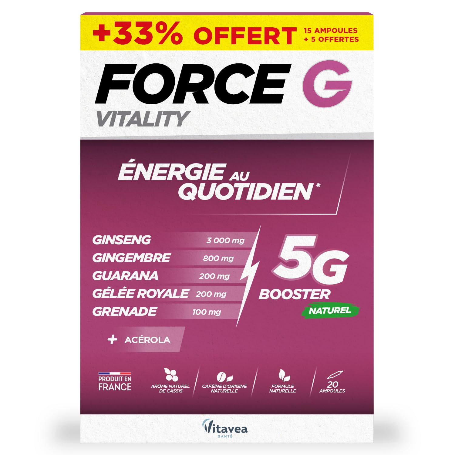 Force G Vitality is the complete solution that combines 5G - ginseng, ginger, guarana, royal jelly, pomegranate - to boost your body on a daily basis. Force G Vitality is a food supplement based on ginseng, ginger, guarana, royal jelly, pomegranate and acerola. Force G Vitality VITAVEA is a food supplement, available in pharmacies and drugstores. INGREDIENTS Water ginseng extract (Panax ginseng) agave syrup ginger extract (Zingiber officinale) concentrated blackcurrant juice (Ribes nigrum) guarana extract (Paullinia cupana, enriched with natural caffeine) royal jelly concentrated acerola juice powder (Malpighia glabra, enriched with vitamin C) concentrated pomegranate juice (Punica granatum) natural blackcurrant flavor. DIRECTIONS FOR USE 1 ampoule per day, diluted in 1 2 glass of water or fruit juice, for 0 days. Can be renewed as often as necessary. SAFETY WARNING Do not exceed the recommended daily dose. To be consumed as part of a varied and balanced diet and a healthy lifestyle. Keep out of reach of young children. Contains caffeine (20 mg per day), not recommended for children and pregnant or breastfeeding women. Not recommended for people taking antidiabetic treatment. Reserved for adults. Not recommended in cases of peptic ulcer, heart problems or hyperthyroidism. In the case of medicinal treatments, seek advice from a healthcare professional. 100 FRENCH FORMULA: Our Force G Vitality food supplement based on Ginseng, Ginger, Guarana, Pomegranate, Royal Jelly and Acerola is manufactured in our laboratories in Vendée in compliance with manufacturing and quality processes. PRACTICAL USE: Force G Vitality is a food supplement composed of natural active ingredients such as ginseng, ginger, guarana, royal jelly, and pomegranate. For complete use, dilute 1 ampoule per day in half a glass of water or fruit juice. This pack contains 10 ampoules for 10 days of use. GOURMET FORMULA: Our Force G Vitality formula with its delicious blackcurrant flavor is composed of recognized natural active ingredients such as acerola and royal jelly as well as a booster called 5G: ginseng, ginger, guarana, royal jelly, pomegranate and will be an ideal ally to regain energy and liveliness on a daily basis. TRIO OF ESSENTIAL ACTIVE INGREDIENTS: Force G Vitality is a dietary supplement that includes three natural active ingredients known for their benefits on the body's energy: ginseng, for the body's daily balance, guarana from which caffeine is derived, which helps support intellectual alertness and ginger, an active ingredient known for thousands of years, helps maintain immunity. NATURAL VITALITY: Our Force G Vitality dietary supplement is the complete energy solution that combines recognized natural active ingredients such as acerola and royal jelly as well as a booster called 5G: ginseng, ginger, guarana, royal jelly, pomegranate, to boost your energy every day! Force G Vitality est la solution complète qui associe les 5G - ginseng, gingembre, guarana, gelée royale, grenade - pour booster votre organisme au quotidien. Force G Vitality est un complément alimentaire à base de ginseng, gingembre, guarana, gelée royale, grenade et acérola. Force G Vitality VITAVEA est un complément alimentaire, disponible en pharmacie et parapharmacie. INGRÉDIENTS Eau extrait de ginseng (Panax ginseng) sirop d'agave extrait de gingembre (Zingiber officinale) jus concentré de cassis (Ribes nigrum) extrait de guarana (Paullinia cupana, enrichi en caféine naturelle) gelée royale poudre de jus concentré d'acérola (Malpighia glabra, enrichi en vitamine C) jus concentré de grenade (Punica granatum) arôme naturel de cassis. MODE D'EMPLOI 1 ampoule par jour, diluée dans 1 2 verre d'eau ou de jus de fruits, pendant é0 jours. Peut être renouvelé aussi souvent que nécessaire. AVERTISSEMENT DE SÛRETÉ Ne pas dépasser la dose journalière recommandée. À consommer dans le cadre d'une alimentation variée et équilibrée et d'un mode de vie sain. Tenir hors de portée des jeunes enfants. Contient de la caféine (20 mg par jour), déconseillé aux enfants et aux femmes enceintes ou allaitantes. Déconseillé aux personnes sous traitement antidiabétique. Réservé à l'adulte. Déconseillé en cas d'ulcère gastro-duodénal, de troubles cardiaques ou d'hyperthyroïdie. En cas de traitements médicamenteux, demander conseil à un professionnel de santé. FORMULE 100 FRANCAISE : Notre complément alimentaire Force G Vitality à base de Ginseng, Gingembre, Guarana, Grenade, Gelée Royale et Acérola est fabriqué dans nos laboratoires en Vendée dans le respect des processus de fabrication et de qualité. UTILISATION PRATIQUE : Force G Vitality est un complément alimentaire composé d'actifs naturels comme le ginseng, le gingembre, le guarana, la gelée royale, et la grenade. Pour une utilisation complète, diluer 1 ampoule par jour dans un demi verre d'eau ou de jus de fruits. Ce pack contient 10 ampoules pour une utilisation de 10 jours. FORMULE GOURMANDE : Notre formule Force G Vitality au bont goût de cassis est composée d'actifs naturels reconnus comme l'acérola et la gelée royale ainsi qu'un booster appelé 5G : ginseng, gingembre, guarana, gelée royale, grenade et sera un allié idéal pour retrouver énergie et vivacité au quotidien. TRIO D'ACTIFS ESSENTIELS : Force G Vitality est un complément alimentaire qui comprend trois actifs naturels reconnus pour leurs bienfaits sur l'énergie du corps : le ginseng, pour l'équilibre de l'organisme au quotidien, le guarana dont est issue la caféine, qui aide au soutien de la vivacité intellectuelle et le gingembre, actif reconnu depuis des millénaires aide au maintien de l'immunité. VITALITE NATURELLE : Notre complément alimentaire Force G Vitality est la solution complète pour l'énergie qui associe des actifs d'origine naturelle reconnus comme l'acérola et la gelée royale ainsi qu'un booster appelé 5G : ginseng, gingembre, guarana, gelée royale, gren