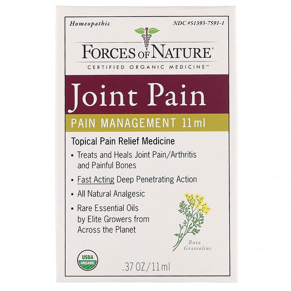 Powerful Medicine Prescribed by NatureForces of Nature proudly provides powerful organic medicines which deliver results time after time. Our organic medicinal plant extract are sourced from elite growers from all over the planet. This includes high in the Himalayan, Andes, and Rocky Mountain; Madagascar; the island of Java of Corsica; and pristine locations in California. We provide the ultimate in purity value for our treatments and customers. These are the world's first line of USDA organic medicines and proudly made in the USA.All our ingredients are organic, sustainably grown, and Fair Trade. We insist on the highest quality standards and believe in the power of our treatments. We think you will too. Satisfaction guarantee.The Powerful of Ruta Graveolens and Aesculus  HippocastanumThis potent combination is very useful to help decrease join pain/stiffness or joint disorders. This medicine not only helps treat sore joints, but also facilitates reversing the origin of the problem.Joint Pain ManagementOur unique dual action approach to healing joint pain and arthritis is fast acting and therapeutic. We blend USDA organic homeopathic medicines designed to balance the system, increase joints mobility and reduce pain, with USDA organic essential oils have specific soothing and calming properties. This dual modality delivers fast and long lasting results after time. It supports the body on systemic and localized cellular level, helping ease joint pain with each application.Uses -  For the temporary relief o minor aches and pains of muscles and joints associated with arthritis.
