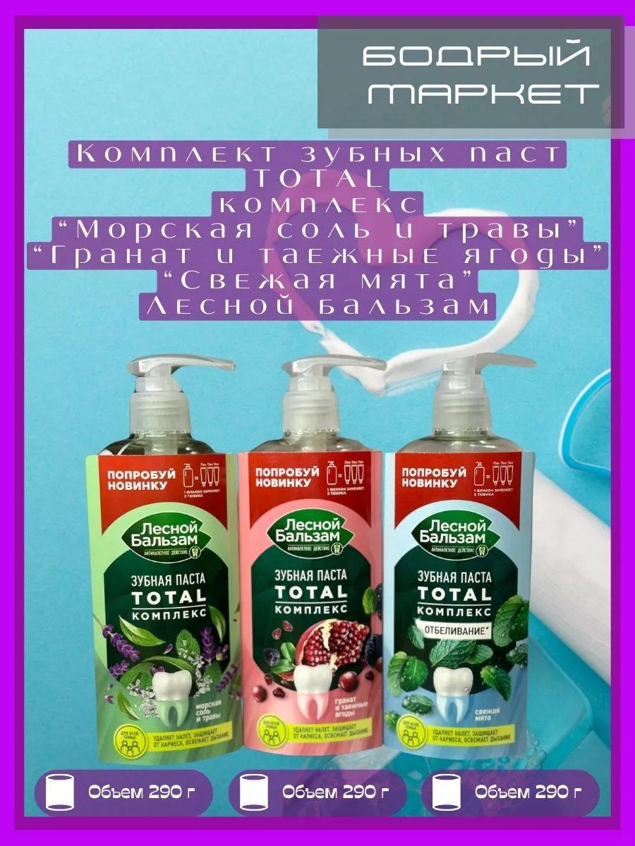 Set (set) of 3 (Sea salt and herbs, Pomegranate and taiga berries, Fresh mint). For daily dental and oral care, try Forest Balsam TOTAL Complex toothpaste for the whole family with Sea salt and herbs, containing 95% natural ingredients. The extra-large bottle with a convenient dispenser is economical to use: one pump is enough for one brushing. The bottle holds 3 tubes of toothpaste and is designed for 4-5 months of use. This toothpaste has a comprehensive effect: It maintains the natural whiteness and health of teeth. It strengthens tooth enamel, preventing tooth sensitivity, thanks to mineral salt and herbal extracts (chamomile, yarrow, St. John's wort, celandine, and nettle). It removes plaque and protects against cavities thanks to the active concentration of sodium fluoride. It gently freshens breath. Brush your teeth for 2-3 minutes at least twice a day. For maximum effect, use Forest Balsam mouthwash after each brushing. It removes plaque from hard-to-reach areas: back teeth, interdental spaces, the inner surface of the teeth, and the tongue. Result: tooth enamel is gently cleaned and gums are protected. Suitable for use by adults and children aged 7 years and older. This is not a medicine. Use does not relieve you from visiting the dentist. The ingredients list natural ingredients. Combined use of Forest Balsam toothpaste and mouthwash provides maximum benefit due to improved oral hygiene compared to using toothpaste alone.