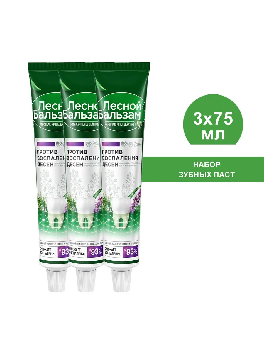 Профилактическая зубная паста Лесной бальзам на отваре трав c иммуноактивным действием помогает решить проблему воспаления десн и в 2 раза улучшает работу собственного иммунитета полости рта, снижая риск развития проблем с деснами*. Клинически-доказанный эффект. С первого применения исчезает болезненность десен. До 94% снижает воспаление десен при регулярном использовании** - В 5 раз снижает скорость образования налета на зубах, уменьшая бактериальную нагрузку на мягкие ткани полости рта** Особенности состава: Насыщенный хвойный вкус. Содержит хвойный комплекс (на основе экстрактов пихты, живицы, можжевельника) с отваром 5 целебных трав, экстрактом шалфея и соком алоэ. Богатый натуральный состав способствует снижению воспаления и отечности десен, блокирует развитие воспалительного процесса и стимулирует восстановление мягких тканей полости рта. Зубная паста изготовлена на отваре 5 трав (ромашка, тысячелистник, крапива, зверобой, чистотел). Отвар трав используется взамен обычной воды и получается в результате низкотемпературной экстракции (35%), что позволяет достичь максимально полного переноса ценных веществ из растений в отвар. Зубная паста бережно очищает эмаль за счет природного абразива - диоксида кремния (Silica). Диоксид кремния не царапает эмаль в процессе чистки зубов, при этом позволяет добиться равномерного удаления налета по всей поверхности зубов. Зубная паста содержит фтор на уровне 1000 ppm, что соответствует среднему уровню содержания фторидов и подходит для ежедневной защиты эмали от деминерализации. Рекомендации: Зубная паста от воспаления десен одобрена Стоматологической Ассоциацией России и рекомендована в качестве профилактического средства при появлении проблем с деснами (гингивит, пародонтит). Использовать 2 раза в день до улучшения состояния десен, после – минимум 1 раз в день, вечером, для укрепления десен. *Свойства подтверждены клиническими испытаниями РФ, 2016-2017.