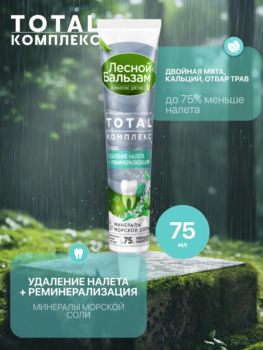 | Комплектация | Лесной Бальзам TOTAL Комплекс зубная паста Двойная мята на отваре трав 75 мл. |