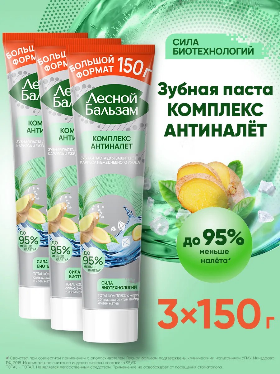Зубная паста Лесной бальзам TOTAL – ТОТАЛ Комплекс «Антиналет + Защита от кариеса» эффективно борется с образованием зубного налета, который вызывает такие проблемы полости рта, как кариес, потемнение эмали, кровоточивость десен и зубной камень.