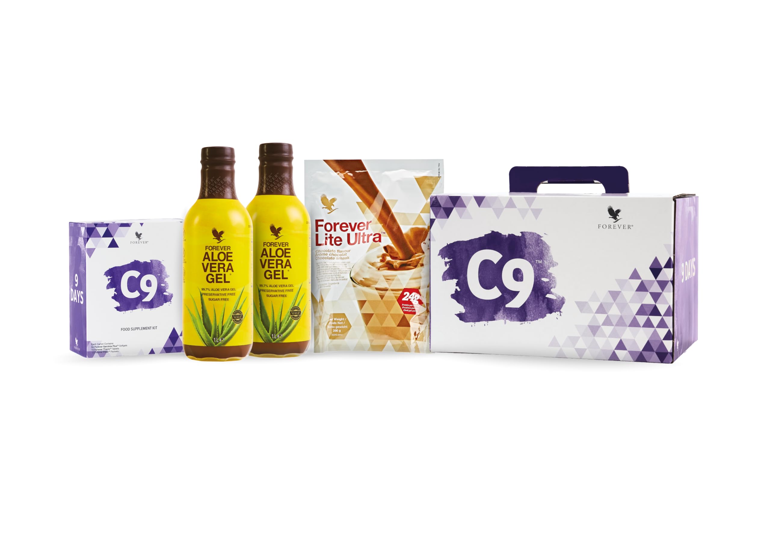 fiber that can help promote a feeling of fullness. FOREVER THERM – Offers a helpful combination of botanical extracts and vitamins that can help boost and support metabolism. Forever Lean – A valuable aid for weight management. Indian fig extract helps modulate and limit the absorption of ingested nutrients and also promotes regular bowel movements. Forever Lite Ultra – A rich blend of vitamins and minerals with 24g of protein per serving. INGREDIENTS Forever Aloe Vera Gel (2 x 1 liter), Forever Lite Ultra Chocolate (15 servings), Forever Therm (18 tablets), Forever Fiber™ (9 sachets)C9 Chocolat - Programme de désintoxication 9 joursDESCRIPTION DU PRODUIT DESCRIPTION DU PRODUIT C9 est un parcours d'une durée de neuf jours qui vous donnera les outils nécessaires pour aider votre organisme à se nettoyer des déchets métaboliques, vous permettant d'atteindre une forme plus mince et de vous diriger vers un mode de vie plus sain. La brochure informative vous guidera jour après jour pour toute la durée du parcours, vous suggérant une bonne alimentation et une activité physique à effectuer pour vous aider à atteindre vos objectifs. Vous trouverez à l'intérieur des produits sélectionnés pour travailler en synergie qui vous seront de soutien pendant ces neuf jours de rupture avec les mauvaises habitudes de lifestyle. Chaque produit du C9, a été soigneusement sélectionné pour travailler en synergie. Aloe Vera Gel – Jusqu'à 99,7 d'aloe vera, aident à protéger le système digestif avec une action apaisante et à maximiser l'absorption des nutriments. Forever