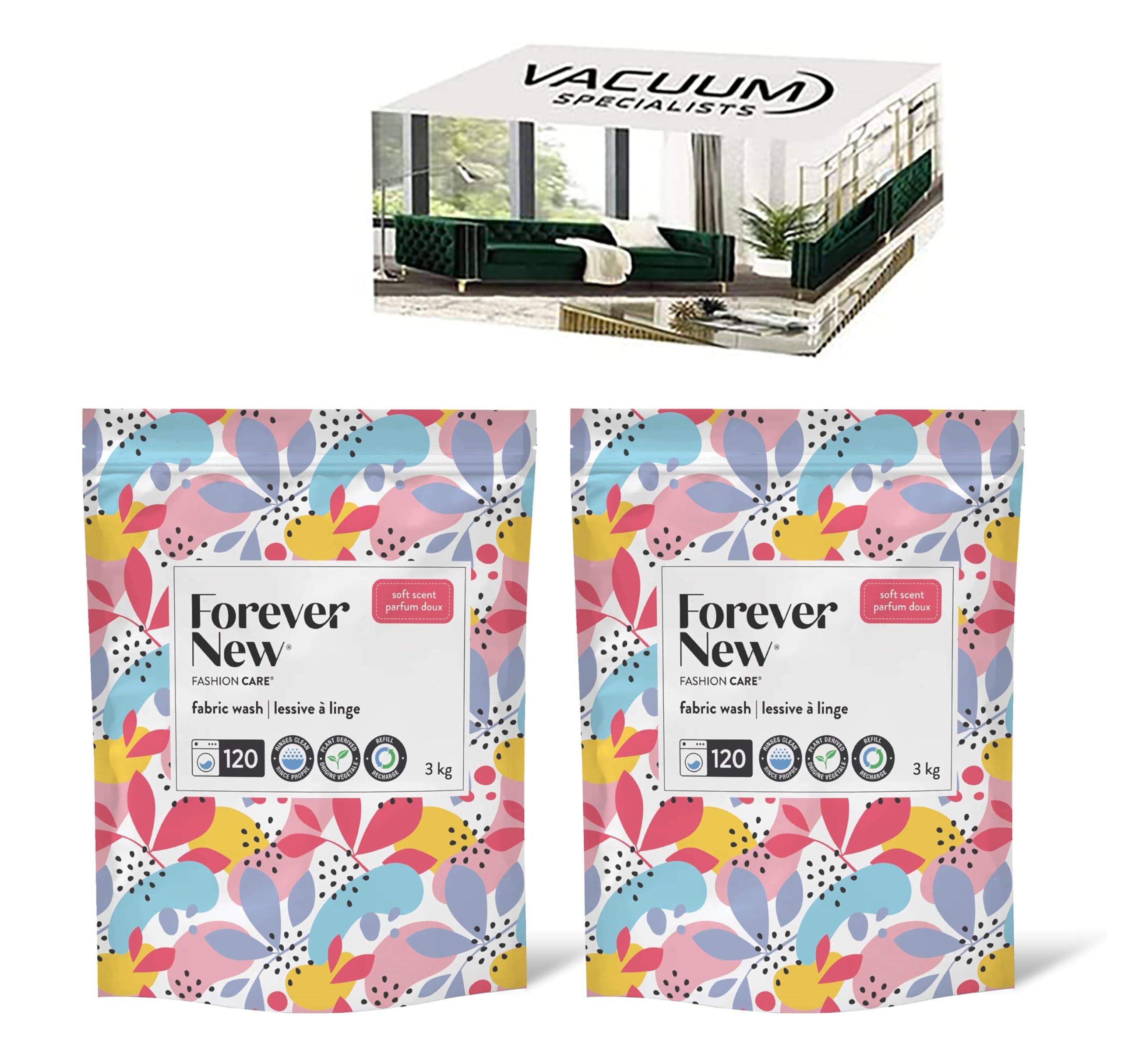 VACUUM SPECIALISTS has been faithfully serving customers since 1970s. If you're not sure which product to purchase, please don't hesitate to contact us. With over 40 years of experience our specialists Will recommend the best product that suits your needs. We appreciate your business and support!VACUUM SPECIALISTS has been faithfully serving customers since 1970s. If you're not sure which product to purchase, please don't hesitate to contact us. With over 40 years of experience our specialists Will recommend the best product that suits your needs. We appreciate your business and support!. 24 7 Technical Support: For Any Information, Questions Or Concerns Please Call Toll-Free at 1-888-277-5511 or Email: info vacuumspecialists.com. Package includes: 2 X Forever New Powder Detergent, 3 kg. (120 HE Loads) each. Eco-friendly laundry detergent: natural, plant-derived, and biodegradable ingredients free from parabens, phthalates dyes, and is never tested on animals. Designed HE and standard washing machines, as well as handwashing for an everyday use. Forever New's self-sealing pouch with measuring scoop yields 96 HE loads or 375 hand washes at pennies per wash!. Forever New's pure citric base gently launders fibres without breaking them down and rinses so clean, preserves the fit and shape of modern fabrics, everything looks newer longer. Forever New Powder is a gentle wash powdered detergent that promotes longer life for all your clothes. This is specially formulated to break down dirt instead of fibres and rinse clean so you can use it on everything from jeans to lingerie and even linens and activewear.