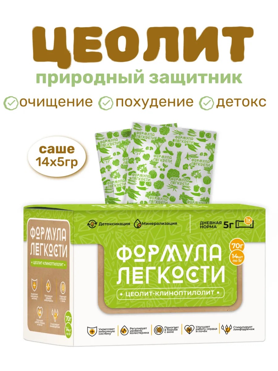 | Комплектация | Цеолит пищевой клиноптилолит детокс и похудение 14 пакетиков по 5 гр |