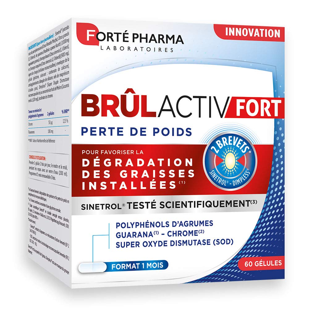 : Brûlante Forte by Forté Pharma is a scientifically proven fat burner. It is composed of two patented ingredients. The SINETROL complex, containing citrus polyphenols (flavanones) and guarana, promotes fat breakdown and weight loss when used in conjunction with dietary measures. This complex has been the subject of a scientific study that has proven the effectiveness of its mechanism of action. Conducted on 95 subjects, it demonstrated more fat broken down (3) in the SINETROL group versus placebo (12-week duration). The ingredient Dimple SS is superoxide discutasse (SOD) extracted from a specific variety of melon (Cucumis Melo L.) and whose micro-encapsulation technology is patented. The slimming action is complemented by chromium, which contributes to the maintenance of normal blood glucose levels. It is in picolinate form for better absorption by the body. Ingredients (per daily dose): Sinetrol (dry extracts of grapefruit (Citrus paradisi Macfad, Citrus grandis (L.) Osbeck), guarana (Paullinia cupana Kunth) (1000 mg seed equivalent), sweet orange (Citrus sinensis (L.) Osbeck), and blood orange (Citrus sinensis (L.) Osbeck)) (900 mg), bulking agent (microcrystalline cellulose), capsule shell (gelatin, color: calcium carbonate), anti-caking agents (silicon dioxide, magnesium salts of fatty acids), Dimpless [microencapsulated superoxide dismutase from melon (Cucumis melo L.) fruit juice concentrate (20 mg)], chromium picolinate. function(data) { window.scroll(0, data.expander. expander[0].offsetTop-100) }) }) Directions for use: Take 1 capsule twice a day, in the morning and at midday, with meals and a glass of water (200 ml). 1-month program, renewable 3 times. Safety Warning: A food supplement should not replace a varied and balanced diet and a healthy lifestyle. Do not exceed the recommended daily dose. Keep out of reach of young children. This food supplement is not a medicine. Contains caffeine (36 mg per daily dose), not recommended for pregnant or breastfeeding women and children. Sustainable weight loss can only be achieved as part of a diet and controlled eating habits. store below 25 C, in a cool, dry place, away from moisture, and in its tightly closed packaging. See moreEU ORIGIN: Made in the European Union. SIMPLE USE: 1 capsule, twice a day with meals, preferably in the morning and at midday with a large glass of water (200 ml). 1-month weight loss program, renewable 3 times. SCIENTIFICALLY TESTED: The Sinestrol complex is a patented complex that has been the subject of a scientific study. Based on citrus polyphenols and Guarana, this complex promotes fat breakdown and weight loss. Dimpless is also patented for its micro-encapsulation technology. FORMULA: BrulActiv Fort combines the Sinestrol complex (citrus polyphenols and Guarana) with Dimpless (Superoxide Dismutase from a variety of French melon) and Chromium. STUCK FAT - DUAL ACTION: BrulActiv Fort is a dual-action fat-burning food supplement. It promotes the breakdown of stored fat and weight loss.Description du produit Brûlante fort de Forté Pharma est un brûleur de graisses à l'efficacité prouvé scientifiquement. Il est composé de 2 ingrédients brevetés. Le complexe SINETROL, contenant des polyphénols d'agrumes (flavanones) ainsi que du guarana qui favorise la dégradation des graisses et la perte de poids en complément de mesures diététiques. Ce complexe a fait l'objet d'une étude scientifique) qui a prouvé l'efficacité de son mécanisme d'action. Menée sur 95 sujets, elle a démontré plus de graisses dégradées(3) dans le groupe SINETROL versus placebo (durée 12 semaines). l'ingrédient Dimple SS: de la super oxyde discutasse (SOD) extraite d'une variété spécifique de melon (Cucumis Melo L.) et dont la technologie de micro-encapsulation est brevetée. l'action minceur est complétée par du chrome qui contribue au maintien d'une glycémie normale). il est sous forme de Picolinate pour une meilleure assimilation par l'organisme. Ingrédients INGRÉDIENTS (par dose journalière): Sinetrol (extraits secs de pamplemousse (Citrus paradisi Macfad, Citrus grandis (L.) Osbeck), de guarana (Paullinia cupana Kunth) (1000 mg equivalent graines), d'orange douce (Citrus sinensis (L.) Osbeck), et d'orange sanguine (Citrus sinensis (L.) Osbeck)] (900 mg), agent de charge (cellulose microcristalline), enveloppe de la gélule (gélatine, colorant : carbonate de calcium), antiagglomérants (dioxyde de silicium, sels de magnésium d'acides gras), Dimpless [Super Oxyde Dismutase microencapsulée de jus concentré de fruit de Melon (Cucumis melo L.) (20 mg)], picolinate de chrome. P.when('A').execute(function(A) { A.on('a:expander:toggle_description:toggle:collapse', function(data) { window.scroll(0, data.expander. expander[0].offsetTop-100) }) }) Mode d'emploi Prendre 1 gélule 2 fois par jour, le matin et le midi, pendant les repas avec un verre d'eau (200 ml). Programme d'1 mois renouvelable 3 fois. Avertissement De Sûreté Un complément alimentaire ne doit pas se substituer à une alimentation variée et équilibrée et à un mode de vie sain. Ne pas dépasser la dose journalière conseillée. Tenir hors de portée des jeunes enfants. Ce complément alimentaire n'est pas un médicament. Contient de la caféine (36 mg par dose journalière), déconseillé aux femmes enceintes ou qui allaitent et aux enfants. L'amincissement durable ne peut être obtenu que dans le cadre de mesures diététiques et d'une hygiène alimentaire contrôlée. À conserver à une température inférieure à 25 C, dans un endroit frais et sec, à l'abri de l'humidité et dans son emballage hermétiquement fermé. Voir plusORIGINE UE : Fabriqué dans l'Union Européenne. UTILISATION SIMPLE : 1 gélule, 2 fois par jour pendant les repas, de préférence le matin et le midi avec un grand verre d'eau (200 ml). Programme perte de poids d'1 mois renouvelable 3 fois. TESTE SCIENTIFIQUEMENT : Le complexe Sinestrol est un complexe breveté
