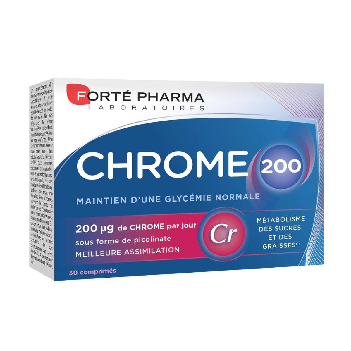 Chrome 200 from Forté Pharma is a food supplement containing 200 µg of chromium per daily dose. Chromium helps maintain normal blood sugar levels. Chromium 200 µg is chromium in the form of Picolant, for better assimilation by the body. Directions for use: take 2 chrome 200 tablets per day outside of meals, preferably at 10 a.m. and 4 p.m., with a large glass of water (200 ml). INGREDIENTS INGREDIENTS: bulking agents (tricalcium citrate, microcrystalline cellulose), coating agents (hydroxypropyl methylcellulose, calcium carbonate, polyethylene glycol), anti-caking agent (magnesium salts of fatty acids), chromium picolinate. SAFETY WARNING A food supplement should not replace a varied and balanced diet and a healthy lifestyle. Follow the instructions for use. Do not exceed the recommended daily dose. Keep out of reach of young children. This food supplement is not a medicine. Not recommended for pregnant or breastfeeding women and children without medical advice. It is recommended to consult a healthcare professional for any use lasting more than 3 months. EU ORIGIN: Made in the European Union. EASY TO USE: 2 capsules with a large glass of water, once a day between meals. 1 month recommended during the weight loss process. HIGH-DOSE FORMULA: 2 tablets 200µg of chromium, or 500 of the recommended nutritional values. SLIMMING AID: Chromium acts as an appetite suppressant because it helps maintain stable blood sugar levels and therefore helps reduce snacking. STOP CRAVINGS: A chromium deficiency can cause food cravings as well as sugar cravings. Chrome 200 de Forté Pharma est un complément alimentaire contenant 200 µg de chrome par dose journalière. Le chrome aide au maintien d'une glycémie normale. Chrome 200 µg est du chrome sous forme de Picolant, pour une meilleure assimilation par l'organisme. Conseils d'utilisation: prendre 2 comprimés de chrome 200 par jour en dehors des repas, de préférence à 10H et 16H, avec un grand verre d'eau (200 ml). INGRÉDIENTS INGRÉDIENTS : agents de charge (citrate tricalcique, cellulose microcristalline), agents d'enrobage (hydroxypropylméthylcellulose, carbonate de calcium, polyéthylène glycol), antiagglomérant (sels de magnésium d'acides gras), picolinate de chrome. AVERTISSEMENT DE SÛRETÉ Un complément alimentaire ne doit pas se substituer à une alimentation variée et équilibrée et à un mode de vie sain. Se conformer aux conseils d'utilisation. Ne pas dépasser la dose journalière conseillée. Tenir hors de portée des jeunes enfants. Ce complément alimentaire n'est pas un médicament. Déconseillé aux femmes enceintes ou qui allaitent et aux enfants sans avis médical. Il est conseillé de consulter un professionnel de santé pour toute utilisation de plus de 3 mois. ORIGINE UE : Fabriqué dans l'Union Européenne. UTILISATION FACILE : 2 gélules avec un grand verre d'eau, une fois par jour en dehors des repas. 1 mois recommandé durant la démarche minceur. FORMULE HAUTEMENT DOSÉE : 2 comprimés 200µg de chrome, soit 500 des valeurs nutritionnelles recommandées. ALLIÉ MINCEUR : Le chrome agit comme un coupe faim car il permet le maintien d'une glycémie stable et donc contribue à la réduction du grignotage. STOP AUX FRINGALES : Une carence en chrome peut causer des fringales ainsi que des envies de sucre.