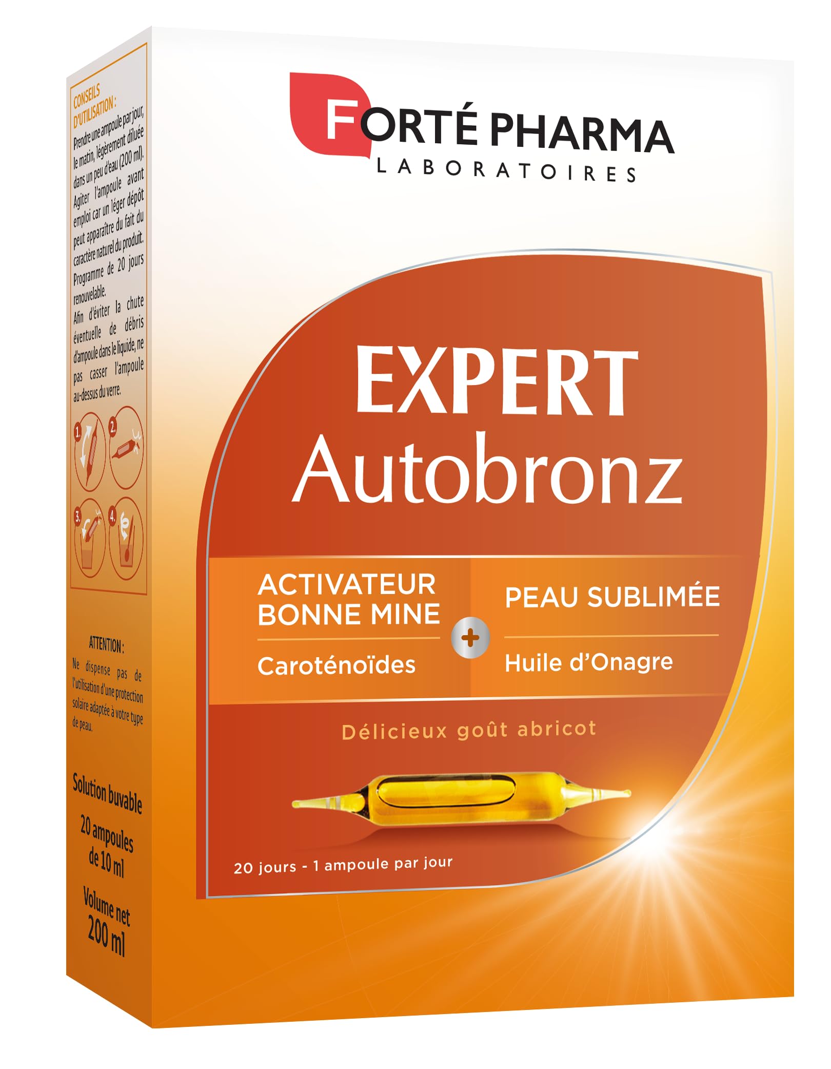: Expert Self-Tanning 20 x 10ml ampoules from Forté Pharma is a food supplement that helps achieve a natural tan without sun exposure. This supplement, based on carotenoids and evening primrose oil, is a true concentrate for a healthy glow. Take one ampoule in the morning, diluted in a little water. Natural apricot flavor. Shake the ampoule before use as a slight sediment may appear due to the natural composition of the product. Ingredients: purified water, fructose, concentrated apricot juice, natural flavorings [carrot extract (Daucus carota), apricot flavoring, tomato extract (Lycopersicum esculentum L.), peach flavoring], evening primrose oil (Oenothera biennis) (50 mg), beta-carotene 10 , sweeteners (acesulfame potassium, sucralose), oligofructose, vegetable protein, vitamin E (D-alpha-tocopherol acetate), citrus bioflavonoids: orange and lemon (Citrus sinensis and Citrus limonum) (3.5 mg). P.when('A').execute(function(A) { A.on('a:expander:toggle_description:toggle:collapse', function(data) { window.scroll(0, data.expander. expander[0].offsetTop-100) }) }) Instructions for use: Shake the ampoule before use as a slight sediment may appear due to the natural nature of the product. To avoid any ampoule fragments falling into the liquid, do not break the ampoule over the glass. Take 1 ampoule daily in the morning, slightly diluted in a little water (200 ml). 20-day course, which can be repeated. Do not exceed the recommended daily dose. Not recommended for pregnant or breastfeeding women and. Safety Warning: This product does not replace the use of sun protection suitable for your skin type. A food supplement should not replace a varied and balanced diet and a healthy lifestyle. Follow the directions for use. Do not exceed the recommended daily dose. Keep out of reach of young children. Not recommended for pregnant or breastfeeding women and children under 12 years of age without medical advice. This food supplement is not a medicine. To avoid any possible ampoule fragments falling into the liquid, do not break the ampoule over the glass. See moreNutraceutical Division, 98000 Monaco, France. Forté Pharma Benelux, Avenue des Arts 56, 1000 Brussels, Belgium. Vitamin content per 1 ampoule (10 ml): NRV Beta-carotene 4.8 mg - (equivalent to vitamin A) 800 µg 100 Vitamin E 10 mg 83 NRV: Nutrient Reference Values. EASY TO USE: Take one ampoule daily, in the morning, slightly diluted in a little water (200 ml). Shake the ampoule before use as a slight sediment may appear due to the natural nature of the product. ? EU ORIGIN: Made in the European Union. ? NATURALLY TAN: Expert Autobronz Ampoules is a drinkable self-tanning food supplement for those who want to enhance their complexion's radiance and achieve a healthy glow. 3 ? 3-INGREDIENT FORMULA: Carrot extract, tomato extract, and beta-carotene activate the healthy glow effect and provide antioxidant protection. Evening primrose oil is added to the formula to enhance the complexion and provide hydration. 2 VITAMINS: Vitamin A and vitamin E strengthen the cells' protective action against oxidative stress. GREAT TASTE - NATURAL: Delicious natural apricot flavor!Description du produit Expert Autobronzant 20 ampoules de 10ml de Forté Pharma est un complément alimentaire qui aide à obtenir un hle naturel sans soleil. Ce complément alimentaire à base de caroténoïdes et d'huile d'onagre est un véritable concentré de bonne mine. Prendre une ampoule le matin, diluée dans un peu d'eau. Aromatisation naturelle au goût abricot. Agiter l'ampoule avant emploi car un léger dépôt peut apparaître du fait du caractère naturel du produit. Ingrédients eau purifiée, fructose, jus concentré d'abricot, arômes naturels [extrait de carotte (Daucus carota), arôme abricot, extrait de tomate (Lycopersicum esculentum L.), arôme pêche], huile d'onagre (Oenothera biennis) (50mg), bêta-carotène 10 , édulcorants (acésulfame de potassium, sucralose), oligofructose, protéine végétale, vitamine E (acétate de D-alpha-tocophérol), bioflavonoïdes de citrus : orange et citron (Citrus sinensis et Citrus limonum) (3,5 mg). P.when('A').execute(function(A) { A.on('a:expander:toggle_description:toggle:collapse', function(data) { window.scroll(0, data.expander. expander[0].offsetTop-100) }) }) Mode d'emploi Agiter l'ampoule avant emploi car un léger dépôt peut apparaître du fait du caractère naturel du produit.Afin d'éviter la chute éventuelle de débris d'ampoule dans le liquide, ne pas casser l'ampoule au-dessus du verre.Prendre 1 ampoule par jour le matin, légèrement diluée dans un peu d'eau (200 ml). Cure de 20 jours renouvelable.Ne pas dépasser la dose journalière conseillée.Déconseillé aux femmes enceintes ou qui allaitent et. Avertissement De Sûreté Ne dispense pas de l'utilisation d'une protection solaire adaptée à votre type de peau. Un complément alimentaire ne doit pas se substituer à une alimentation variée et équilibrée et à un mode de vie sain. Se conformer aux conseils d'utilisation. Ne pas dépasser la dose journalière conseillée. Tenir hors de portée des jeunes enfants. Déconseillé aux femmes enceintes ou qui allaitent et aux enfants de moins de 12 ans sans avis médical. Ce complément alimentaire n'est pas un médicament. Afin d'éviter la chute éventuelle de débris d'ampoule dans le liquide, ne pas casser l'ampoule au dessus du verre. Voir plusDivision Nutraceutique, 98000 Monaco, France. Forté Pharma Benelux, Avenue des Arts 56, 1000 Bruxelles (Belgique). Teneur en vitamines 1 amp. 10 ml VNR Bêta-carotène 4,8 mg - (équivalent vit. A) 800 ug 100 Vitamine E 10 mg 83 VNR: Valeurs Nutritionnelles de Référence. UTILISATION SIMPLE : Prendre une ampoule par jour, le matin, légèrement diluée dans un peu d'eau (200 ml). Agiter l'ampoule avant emploi car un léger dépôt peut apparaître du fait du caractère naturel du produit. ? ORIGINE UE : Fabriqué dans l'Union européenne. ? BRONZER NATURELLEM
