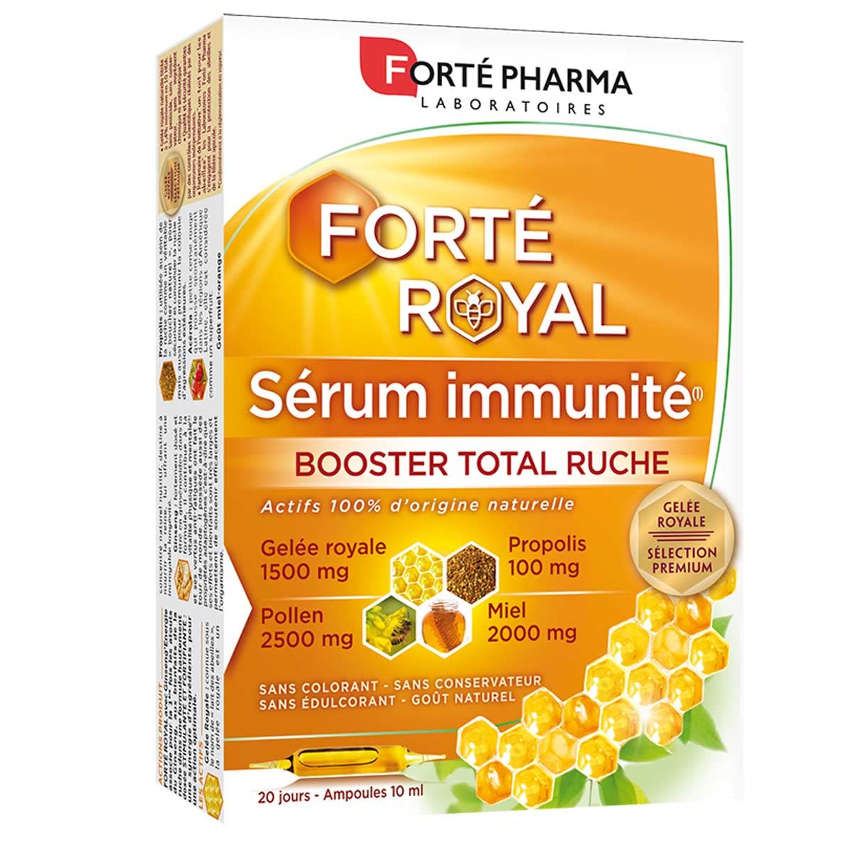 : Royal Serum 20 ampoules from Forté Pharma is an immunity-boosting food supplement(1). Its exclusive complex of 4 beehive products (royal jelly, pollen, honey, and propolis) provides all the necessary ingredients in a single ampoule. Royal Serum is a concentrated blend of beehive ingredients to help boost the body's natural defenses. Drink 1 ampoule of Royal Serum every morning, diluted in a glass of water or fruit juice (200 ml). Due to its high concentration, the formula may be more or less easy to dispense. Shake before use. To avoid any ampoule fragments falling into the liquid, do not break the ampoule over the glass.(1) Pollen helps strengthen the body, promotes good vitality, and helps boost natural immunity. Ingredients (per daily dose): Purified water, aqueous pollen extract (2500 mg equivalent to 500 mg of pollen), honey (2000 mg), royal jelly (1500 mg), hydroglycerin propolis extract (100 mg), stabilizer (acacia gum). Safety Warning: A food supplement should not replace a varied and balanced diet and a healthy lifestyle. Follow the directions for use. Do not exceed the recommended daily dose. Keep out of reach of young children. Not recommended for pregnant or breastfeeding women, or children under 12 years of age without medical advice. Don't hesitate to ask your pharmacist for advice. Gluten-free, gelatin-free. Not recommended for people allergic to bee products, those with asthma, or those with atopic dermatitis. See more