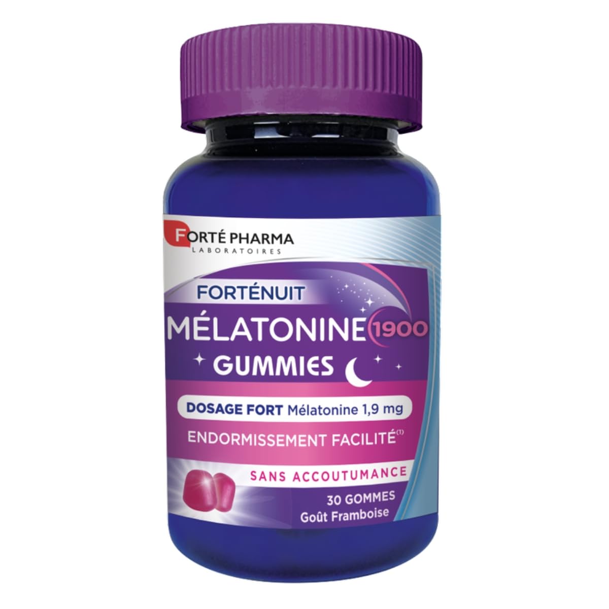 Melatonin, naturally present in the body, is also called the "sleep hormone". Forté Pharma Laboratories have developed FORTÉ NUIT MELATONIN 1900 GUMMIES, a melatonin-based dietary supplement that promotes faster sleep onset and helps alleviate the effects of jet lag . INGREDIENTS INGREDIENTS (per daily dose): sweeteners (maltitol, sorbitol), water, gelling agent (pectin), acidifier (citric acid), acidity regulator (trisodium citrate), colour (anthocyanins), vegetable oil (Cocos nucifera L.), natural flavouring, melatonin (1.9 mg), anti-caking agent (carnauba wax). SAFETY WARNING Do not exceed the recommended daily dose indicated. The product must be kept out of reach of children. The supplement should not be used as a substitute for a varied healthy diet. ✓ EU ORIGIN: Made in the European Union. NON-HABITING - GLUTEN FREE - LACTOSE FREE - GELATIN FREE. SIMPLE TO USE - RASPBERRY FLAVOR: If you have trouble falling asleep: take a maximum of one chewable gum per day, in the evening, 30 minutes before bedtime. FORMULA - HIGH DOSAGE OF MELATONIN 1.9 mg: Melatonin, naturally present in the body, is also called the "sleep hormone". It helps regulate chronobiological rhythms and promotes sleep. FAST SLEEP ACTION: FortéNuit Melatonin 1900 Gummies from Forté Pharma is a sleep food supplement based on high-dose melatonin, which promotes rapid sleep and helps alleviate the effects of jet lag . La mélatonine, naturellement présente dans l'organisme, est aussi dénommée « hormone du sommeil ». Les Laboratoires Forté Pharma ont mis au point FORTÉ NUIT MÉLATONINE 1900 GUMMIES, un complément alimentaire à base de mélatonine, qui favorise un endormissement plus rapide et aide à atténuer les effets du décalage horaire . INGRÉDIENTS INGRÉDIENTS (par dose journalière) : édulcorants (maltitol, sorbitol), eau, agent gélifiant (pectine), acidifiant (acide citrique), correcteur d'acidité (citrate trisodique), colorant (anthocyanes), huile végétale (Cocos nucifera L.), arôme naturel, mélatonine (1,9 mg), anti-agglomérant (cire de carnauba). AVERTISSEMENT DE SÛRETÉ Ne pas dépasser la dose quotidienne recommandée indiquée. Le produit doit être conservé hors de la portée des enfants. Le supplément ne doit pas se substituer à une alimentation variée saine. ✓ ORIGINE UE : Fabriqué dans l'Union Européenne. SANS ACCOUTUMANCE - SANS GLUTEN - SANS LACTOSE - SANS GELATINE. UTILISATION SIMPLE - GOÛT FRAMBOISE : En cas de difficultés à trouver le sommeil : prendre au maximum une gomme à mâcher par jour, le soir, 30 minutes avant le coucher. FORMULE - DOSAGE FORT EN MÉLATONINE 1,9 mg : La mélatonine, naturellement présente dans l'organisme, est aussi dénommée « hormone du sommeil ». Elle participe à la régulation des rythmes chronobiologiques et favorise l'endormissement. ACTION SOMMEIL RAPIDE : FortéNuit Mélatonine 1900 Gummies de Forté Pharma est un complément alimentaire sommeil à base de mélatonine hautement dosée, qui favorise un dormir rapidement et aide à atténuer les effets du décalage horaire .
