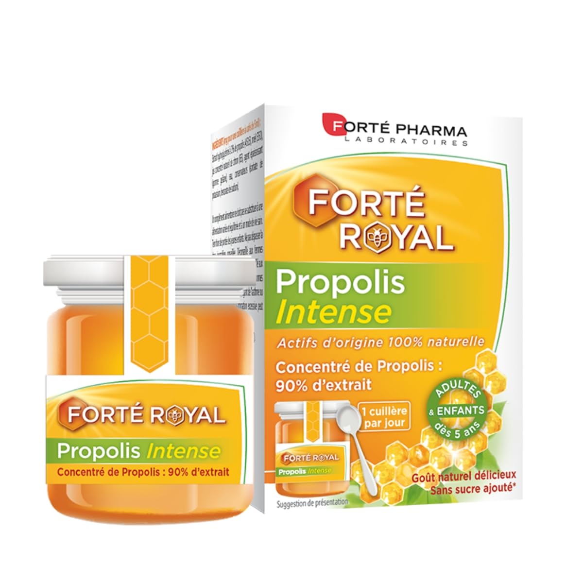 : Intense Propolis from the Forte Royal range by Forte Pharma is a propolis-based food supplement. It combines 90 propolis extract, known for its beneficial properties, with honey and lemon juice. Ingredients: 2 hydroglycerin propolis extract (5690), honey (378), water, natural concentrated lemon juice, thickening agent (gellan gum), preservatives (potassium sorbate, sodium benzoate). Safety Warning: A food supplement should not replace a varied and balanced diet and a healthy lifestyle. Keep out of reach of young children. Do not exceed the recommended daily dose. Not recommended for pregnant or breastfeeding women without medical advice. Not recommended for children under 5 years old. Not recommended for people allergic to bee products, those with asthma, or those with atopic dermatitis. Excessive consumption may have a laxative effect. See more