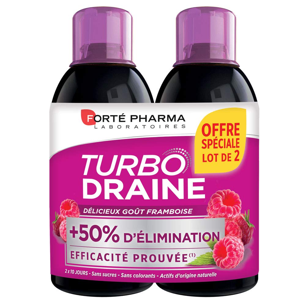 : Specially formulated by the Research and Development Department of Forté Pharma Laboratories, Turbodraine combines plant-based active ingredients to offer you a slimming ally(3) with a delicious raspberry flavor. A complete drainage aid(2), Turbodraine helps you: • Drain and purify your body: its formula is composed of active ingredients such as Meadowsweet and Green Tea, known to promote water elimination(2). • Burn calories thanks to the action of Green Tea, which stimulates lipid metabolism(3). (1)Urine volume measurement - TBD Survey 09 2017 - 29 people (self-assessment). (2)Meadowsweet promotes kidney function Green tea is known to promote water elimination. (3)Green tea stimulates lipid metabolism. Ingredients Water, natural raspberry flavor, acidifier: citric acid, natural flavors, sweeteners: acesulfame potassium and sucralose, preservatives: potassium sorbate and sodium benzoate, queen of the meadows extract (Filipendula ulmaria) 0.1 , green tea extract (Camellia sinensis) 0.1 , ash extract (Fraxinus excelsior) 0.05 , dandelion extract (Taraxacum officinale) 0.05 , artichoke extract (Cynara scolymus) 0.05 P.when('A').execute(function(A) { A.on('a:expander:toggle_description:toggle:collapse', function(data) { window.scroll(0, data.expander. expander[0].offsetTop-100) }) }) Instructions for use Shake before use. Dilute one 10ml capful in a large glass of water, 5 times a day. Once opened, keep refrigerated and consume within 15 days. The recommended duration of use is 10 days, in addition to a low-calorie diet. This program can be repeated for 3 weeks at each change of season. It is recommended to drink 1.5 liters of water per day. For variety, it is also available in green tea-peach, raspberry, and citrus flavors. A food supplement should not replace a varied and balanced diet and a healthy lifestyle. Do not exceed the recommended daily dose. Not recommended for use between meals. Keep out of reach of young children. This food supplement is not a medicine. Sustainable weight loss can only be achieved through dietary measures and controlled food hygiene. store below 25 C and away from moisture in its tightly closed packaging. Safety Warning: Shake before use. Dilute one 10ml capful in a large glass of water, 5 times a day. Once opened, keep refrigerated and consume within 15 days. The recommended duration of use is 10 days, in addition to a low-calorie diet. This program can be repeated for 3 weeks at each change of season. It is recommended to drink 1.5 liters of water per day. For variety, it is also available in green tea-peach, raspberry, and citrus flavors. A food supplement should not replace a varied and balanced diet and a healthy lifestyle. Do not exceed the recommended daily dose. Not recommended for use between meals. Keep out of reach of young children. This food supplement is not a medicine. Sustainable weight loss can only be achieved through dietary measures and controlled food hygiene. store below 25 C and away from moisture in its tightly closed packaging. See more? EU ORIGIN: Made in the European Union. EASY TO USE: Dilute one 10ml capful in a large glass of water, 5 times a day OR dilute 5 10ml capfuls directly in a 1L bottle of water. Drink throughout the day! 20-day program. DELICIOUS RASPBERRY FLAVOR: TurboDraine, when diluted in water, has a delicious raspberry flavor, combining slimming and pleasure! Our formula is free of colorings and sugars. ? SUITABLE FOR VEGETARIANS: Formula with naturally derived active ingredients! ? PROVEN EFFECTIVENESS: TurboDraine increases elimination by over 50 . SLIMMING DRAINER: TURBODRAINE Raspberry offers a complete formula that works deep down. Combining Meadowsweet (known to promote water elimination) and Green Tea (stimulating lipid breakdown), its formula has been designed to drain and purify your body, and burn calories.Description du produit Spécialement formulé par le Département Recherche et Développement des Laboratoires Forté Pharma, Turbodraine associe des actifs d'origine végétale pour vous offrir un allié minceur(3) au bon goût framboise. Draineur(2) complet, Turbodraine vous aide à : • Drainer et purifier votre organisme : sa formule est composée d'actifs tels que la Reine des Prés et le Thé vert reconnus pour favoriser l'élimination de l'eau(2). • Brûler les calories grâce à l'action du Thé vert qui stimule le métabolisme des lipides(3). (1)Mesure du volume urinaire - Enquête TBD 09 2017 - 29 personnes (auto-évaluation). (2)La reine des prés favorise la fonction d'élimination des reins Le thé vert est connu pour favoriser l'élimination de l'eau. (3)Le thé vert stimule le métabolisme des lipides. Ingrédients Water, natural raspberry flavor, acidifier: citric acid, natural flavors, sweeteners: acesulfame potassium and sucralose, preservatives: potassium sorbate and sodium benzoate, queen of the meadows extract (Filipendula ulmaria) 0.1 , green tea extract (Camellia sinensis) 0.1 , ash extract (Fraxinus excelsior) 0.05 , dandelion extract (Taraxacum officinale) 0.05 , artichoke extract (Cynara scolymus) 0.05 P.when('A').execute(function(A) { A.on('a:expander:toggle_description:toggle:collapse', function(data) { window.scroll(0, data.expander. expander[0].offsetTop-100) }) }) Mode d'emploi Agiter avant emploi. Diluer un bouchon de 10 ml dans un grand verre d'eau, 5 fois par jour. Après ouverture, conserver au frais et consommer dans les 15 jours. La durée d'utilisation recommandée est de 10 jours, en complément d'un régime hypocalorique. Programme renouvelable de 3 semaines à chaque changement de saison. Il est recommandé de boire 1,5 litre d'eau par jour. Pour varier les plaisirs, existe aussi aux goûts thé vert-pêche, framboise et agrumes. Un complément alimentaire ne doit pas se substituer à une alimentation variée et équilibrée et à un mode de vie sain. Ne pas dépasser la dose journalière recommandée. Utilisation déconseillée en dehors des repas. Teni