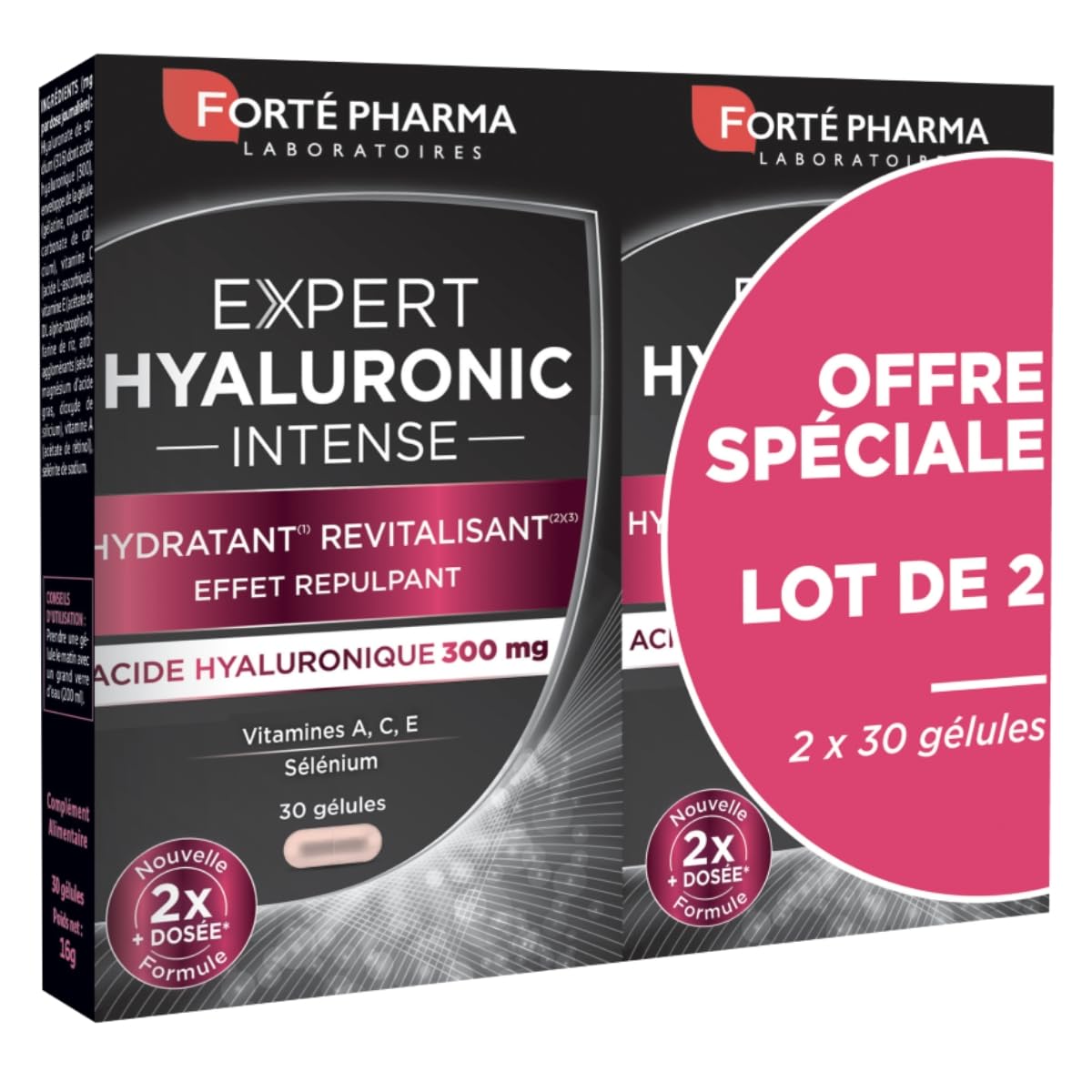Forté Pharma Laboratories' research has developed Expert Hyaluronic Intense, an anti-aging food supplement that helps hydrate, revitalize(1), and plump the skin. Its formula is highly concentrated in hyaluronic acid, promoting skin hydration. Expert Hyaluronic Intense plumps the skin from within, improves its elasticity, and reveals its radiance. Expert Hyaluronic Intense helps protect against premature skin aging(2) thanks to its antioxidant complex composed of vitamins C, E, and selenium. (1) Vitamin A contributes to the maintenance of normal skin. (2) Vitamins C and E and selenium contribute to the protection of cells against oxidative stress. INGREDIENTS INGREDIENTS (mg per daily dose): Sodium hyaluronate (316 mg) including hyaluronic acid (300 mg), capsule shell (gelatin, color: calcium carbonate), vitamin C (L-ascorbic acid), vitamin E (DL-alpha-tocopherol acetate), rice flour, anti-caking agents (magnesium salts of fatty acids, silicon dioxide), vitamin A (retinyl acetate), sodium selenite. DIRECTIONS Take one capsule in the morning with a large glass of water (200 ml). SAFETY WARNING A food supplement should not replace a varied and balanced diet and a healthy lifestyle. Keep out of reach of young children. Do not exceed the recommended daily dose. Not recommended for pregnant or breastfeeding women and children under 12 years of age without medical advice. This food supplement is not a medicine. See moreEU ORIGIN: Made in the European Union. SIMPLE USE: 1 capsule once a day in the morning with a glass of water. 2-month supply. VITAMINS: Formula enriched with vitamins A, C, and E for healthy, radiant skin. ULTRA-DOSE FORMULA: Expert Hyaluronic Intense offers a high-dose formula with 300mg of Hyaluronic Acid combined with an antioxidant complex (composed of Vitamins A, C, and E) and enriched with Selenium. Gluten-free, lactose-free. ANTIOXIDANT FORMULA: Selenium, an antioxidant mineral, protects cells from oxidative stress. PLUMPLED SKIN: A formula with Hyaluronic Acid, the ultimate anti-aging, hydrating, and plumping agent.Forté Pharma - Expert Hyaluronic Intense Complément Alimentaire Peau à base d'Acide Hyaluronique - Hydratation et Effet Repulpant Lot de 2x 30 gélules Expert Hyaluronic Intense Lot de 2 x 30 gélulesDESCRIPTION DU PRODUIT DESCRIPTION DU PRODUIT La recherche des Laboratoires Forté Pharma a mis au point Expert Hyaluronic Intense, un complément alimentaire à l'action anti-âge qui aide à hydrater, revitaliser(1) et repulper la peau. Sa formule est hautement dosée en acide hyaluronique, et favorise l'hydratation de la peau. Expert Hyaluronic Intense repulpe la peau de l'intérieur, améliore son élasticité et révèle tout son éclat. Expert Hyaluronic Intense aide à protéger du vieillissement cutané prématuré(2) grâce au complexe anti-oxydant composé des vitamines C, E et du Sélénium. (1)La vitamine A contribue au maintien d'une peau normale. (2)Les vitamine C et E et le sélénium contribuent à protéger les cellules contre le stress oxydatif. INGRÉDIENTS INGRÉDIENTS (mg par dose journalière) : Hyaluronate de sodium (316) dont acide hyaluronique (300), enveloppe de la gélule (gélatine, colorant : carbonate de calcium), vitamine C (acide L-ascorbique), vitamine E (acétate de DL alpha-tocophérol), farine de riz, antiagglomérants (sels de magnésium d'acide gras, dioxyde de silicium), vitamine A (acétate de rétinol), sélénite de sodium. MODE D'EMPLOI Prendre une gélule le matin avec un grand verre d'eau (200 ml). AVERTISSEMENT DE SÉCURITÉ Un complément alimentaire ne doit pas se substituer à une alimentation variée et équilibrée et à un mode de vie sain. Tenir hors de portée des jeunes enfants. Ne pas dépasser la dose journalière conseillée. Déconseillé aux femmes enceintes ou qui allaitent et aux enfants de moins de 12 ans sans avis médical. Ce complément alimentaire n'est pas un médicament. Voir plusORIGINE UE : Fabriqué dans l'Union européenne. UTILISATION SIMPLE : 1 gélule 1 fois par jour le matin avec un verre d'eau. Format 2 mois. VITAMINES : Formule renforcée par les vitamines A, C et E pour une peau Saine et en bonne Santé. FORMULE ULTRA DOSÉE : Expert Hyaluronic Intense propose une formule hautement dosée en Acide Hyaluronique à 300mg associée à un complexe anti-oxydant (composé de Vitamines A, C et E) et renforcée en Sélénium. Sans gluten, sans lactose. FORMULE ANTI-OXYDANTE : le Sélénium, minéral anti-oxydant, protège les cellules du stress oxydatif. PEAU REPULPÉE : une formule à l'Acide Hyaluronique, anti-âge, hydratant et repulpant par excellence.