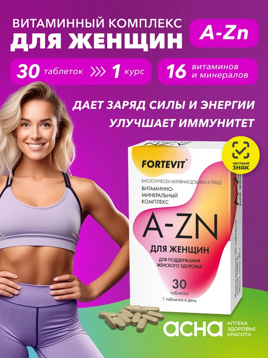 The health and beauty of every woman largely depend on a balanced diet that provides the body with everything it needs. Supplementing your diet with vitamins and microelements daily is an important female secret to well-being, vitality, a well-groomed appearance, and an elevated mood. The main advantages of Fortevit vitamin complex for women: A balanced composition of vitamins and minerals, developed specifically for women, with time-tested ingredients. Convenient administration - just one tablet a day. Affordable price per course of treatment. Does not contain sugar. Recommended: For women to normalize metabolism. For women to maintain healthy skin, hair, and nails. For women to prevent aging, maintain vitality, and maintain mood. For women on a diet. Directions: Adults, take 1 tablet daily with meals. Duration of treatment - 1 month.