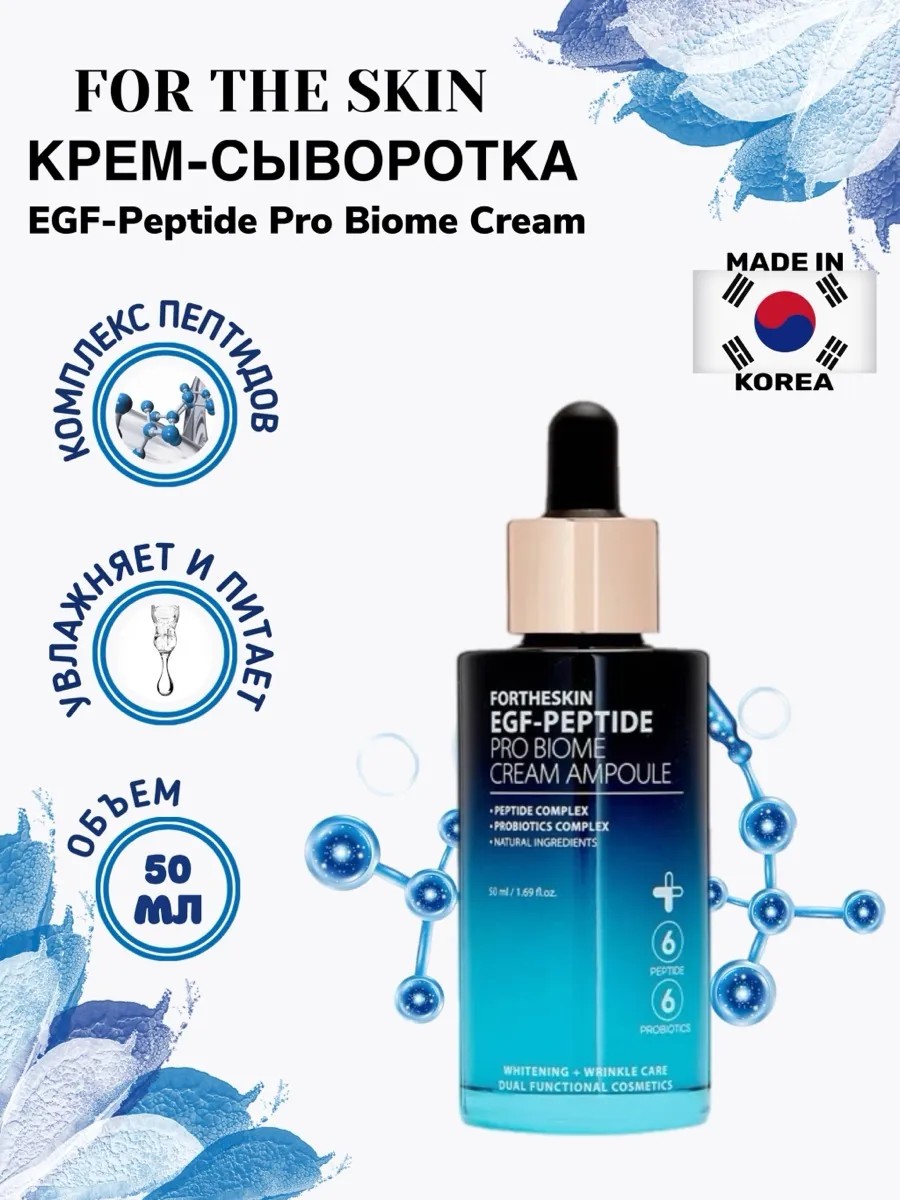FOR THE SKIN EGF-Peptide Pro Biome Cream Ampoule is a rejuvenating serum-cream for intensive skin restoration. The formula combines a powerful peptide complex and probiotics that stimulate cell renewal, improve elasticity, and reduce the signs of aging.