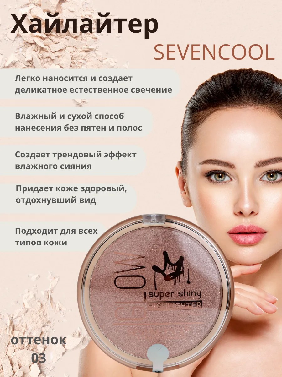 Создайте неповторимое сияние с помощью сухого хайлайтера SEVENCOOL в оттенке 03! Идеальный акцент для вашего макияжа: он мягко подсвечивает кожу, придавая ей свежий, ухоженный вид и естественное сияние. Легко наносится, равномерно растушёвывается и подходит для любого типа кожи.