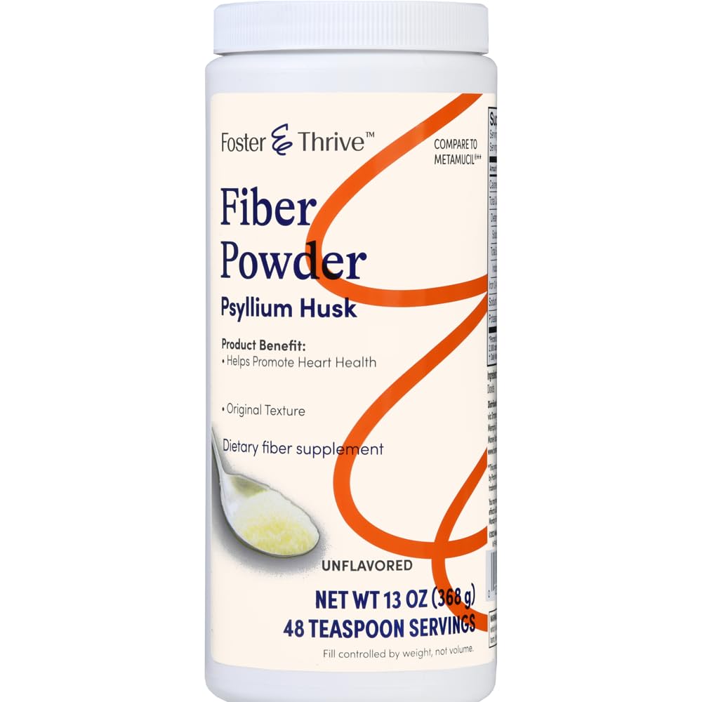 "FOSTER THRIVE DAILY PSYLLIUM FIBER SUPPLEMENTS, THE GO-TO CHOICE FOR YOUR PSYLLIUM NUTRITIONAL SUPPLEMENT. Are you feeling weighed down and sluggish? You're not alone. It might be time to give your digestive system the support it needs to thrive. Foster Thrive Daily Psyllium Fiber is formulated to trap and remove the waste that's dragging you down, so you can experience a lighter, more energetic you. Your digestive system is crucial for overall health and well-being, and it deserves the best care every day. With only 10 of Americans getting enough fiber in their diets, Foster Thrive Daily Psyllium Husk Powder supplement fills the gap by providing essential fiber for optimal digestive function. Natural Laxative: Relieves occasional constipation naturally. Original Flavor: Enjoy the pure taste without added flavors. High-Quality Ingredients: Made from premium psyllium husk, ensuring maximum effectiveness. Easy to Use: Simple daily supplement to incorporate into your routine. USAGE DIRECTIONS: Mix one tablespoon of Foster Thrive Daily Psyllium Husk Powder Supplement with at least 8 ounces of water or juice. Stir briskly and drink immediately. Use once daily, or as directed by your healthcare provider. 48 doses per jar Compare to Metamucil 4-in-1 Fiber Supplement Experience the benefits of Foster Thrive Daily Psyllium Fiber supplements and enjoy substantial savings compared to Metamucil Fiber Powder. Foster Thrive Daily Psyllium Fiber provides the same high-quality ingredients at an economical price point, ensuring you get the best value for your money. With our psyillum fiber, you can achieve your health goals without breaking the bank. Invest in your well-being while saving big. Don't compromise on quality or affordability—choose Foster Thrive Daily Psyllium Fiber for optimal digestive health and unmatched value.