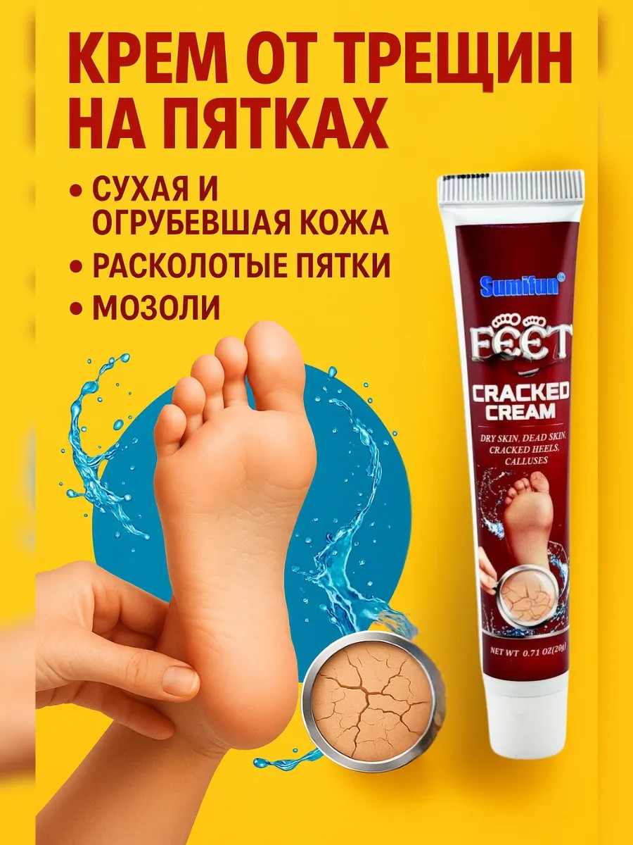 Sumifun foot cream for cracked feet is specially formulated for intensive care of dry, rough, and damaged skin. It effectively softens and moisturizes, helping eliminate cracks, calluses, corns, and flaking. Active ingredients promote accelerated skin healing, improve elasticity, and prevent the recurrence of cracks. Suitable for daily use, especially during cold weather or when feet are subject to increased stress. Its light texture absorbs quickly without leaving a sticky or greasy residue. Regular use restores soft, smooth, and healthy-looking skin.