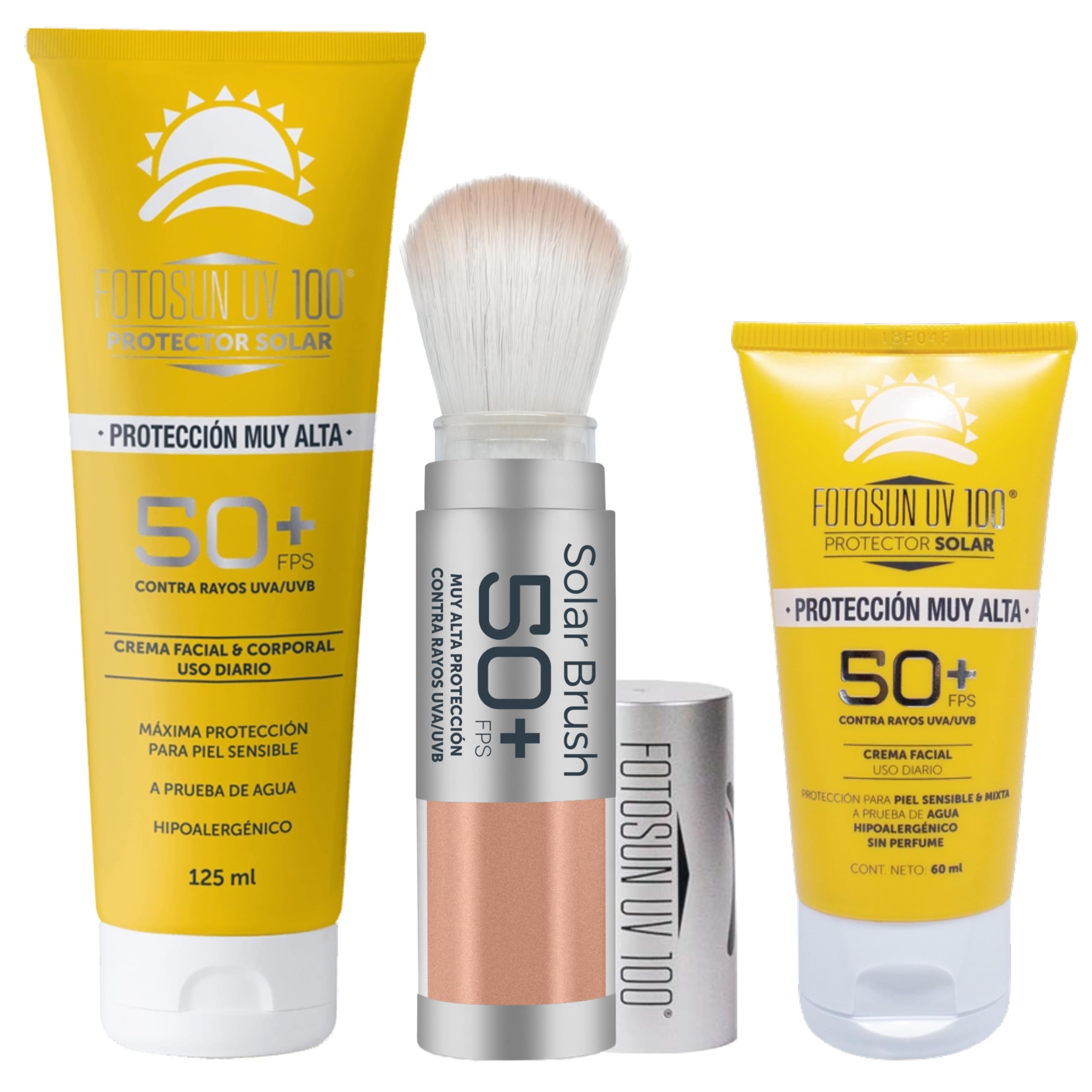 UV FOTOSUN KIT 2: 1 FOTOSUN UV 100 FACE BODY CREAM 125ml 1 FOTOSUN UV 100 FACIAL 60ml 1 FOTOSUN UV 100 SOLAR BRUSH 4g Provides a broad spectrum of protection against UVA and UVB rays. FOTOSUN UV 100 UPF 50 has been designed to block and protect skin from UVA and UVB ultraviolet rays, which cause premature aging, skin thickening and even more serious injuries such as skin cancer. Very high protection For sensitive skin Water resistant Hypoallergenic Moisturizing Non-Commodogenic Non-irritating Paraben free. FOTOSUN UV 100 FACE BODY CREAM 125ml It is a sunscreen that helps prevent against the damage caused by UVA and UVB ultraviolet rays, which cause premature aging, thickening of the skin and even more serious injuries such as skin cancer. FOTOSUN UV 100 FACIAL 60ml It is a sunscreen that helps prevent against the damage caused by UVA and UVB ultraviolet rays, which cause premature aging, thickening of the skin and even more serious injuries such as skin cancer. TrunSOLAR BRUSH 4g It is the brush with sunscreen powder, with very high protection, that provides coverage that minimizes skin shine. The fine and light texture, which will not generate dust pests on the face. At DACLAF Pharma Goods we are proud to be able to serve you and appreciate your preference.