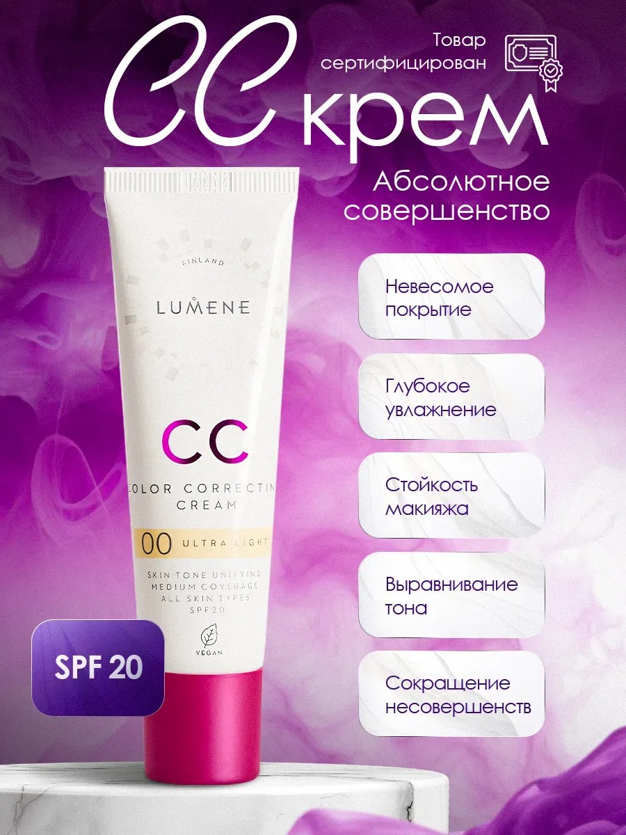 сс крем Люмене ( CC cream Lumene ) обладает воздушной текстурой, ложится на лицо равномерным слоем, подстраивается под естественный тон кожи. Увлажняющий тональный крем для лица подходит для всех тов кожи, не забивает поры, скрывает пигментные пятна. Профессиональная косметика на водной основе обеспечивает защиту от UV лучей благодаря SPF 20. cc крем для лица универсальное тональное средство по уходу за лицом не сушит кожу, отлично наносится и распределяется, макияж держится весь день. СС крем для лица универсален тем, что он и тональный крем для макияжа, так и spf крем для лица с защитой от солнца. Данный крем для лица с spf 20 держит под защитой ваше лицо до 12 часов, сохраняет увлажненность кожи за счет гиалуроновой кислоты в составе, и делает уход за кожей еще более эффективной. Если у вас проблемная кожа, и требует уход за лицом в виде щадящего тонального крема с не закупоривающей и легкой текстурой, то данный крем оправдает все ожидания на 100%. Преимущественные свойства сс крема это то, что крем придает ровный рельеф коже, дарит равномерный тон для лица, обеспечивает упругость кожи, не скатывается и не окисляется. Также дает возможность использовать в виде корректора если на покраснения или пятно на коже намазать крем, подсушить слегка, и потом растушевать. сс-крем имеет уровень покрытия 3 из 5. НОВЫМ СЕЛЛЕРАМ КОПИРОВАТЬ ФОТОГРАФИИ И ЗАПРЕЩЕНО!!! ПРИСУТСТВУЮТ АВТОРСКИЕ ПРАВА НА КОНТЕНТ!